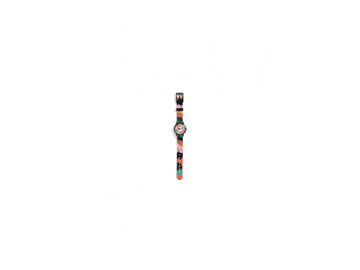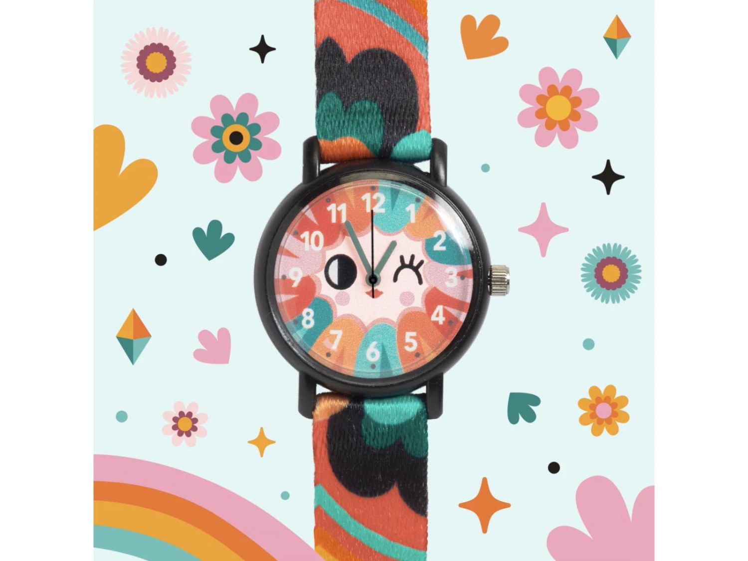 Une montre à quartz élégante avec des illustrations colorées très pop pour apprendre à lire l’heure.