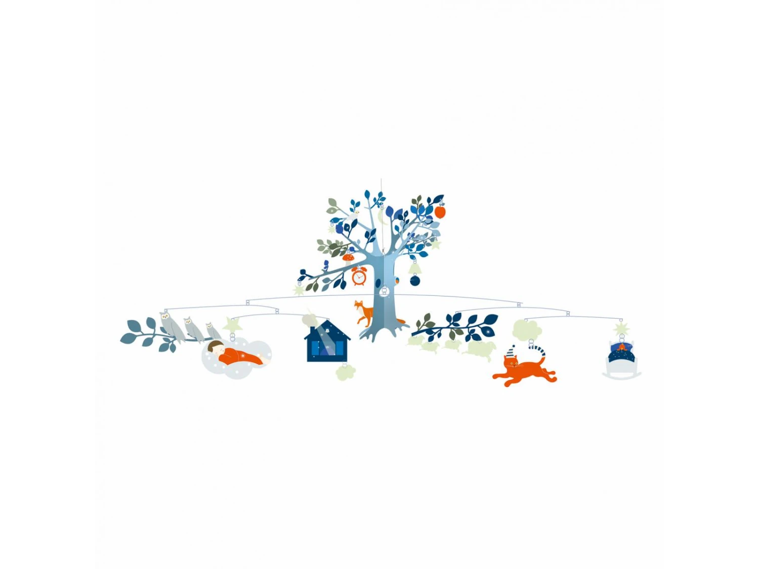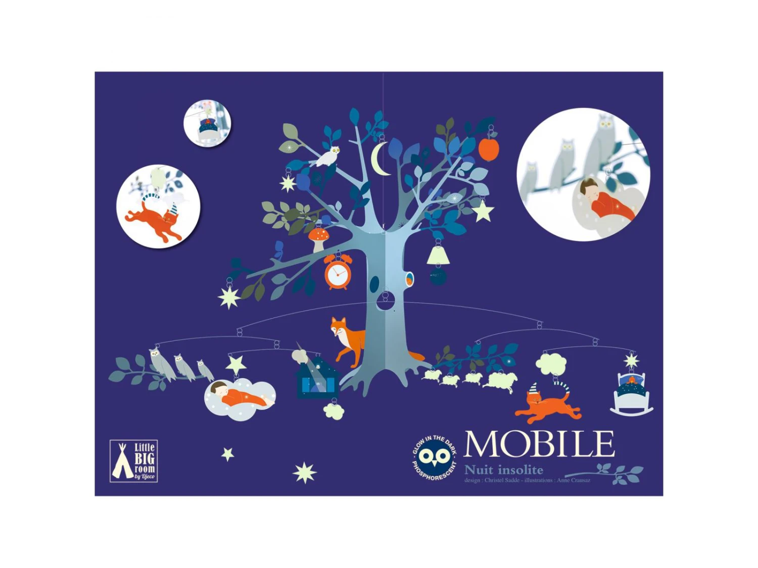 Un grand mobile léger pour admirer un décor nocturne graviter autour d’un arbre. Phosphorescent, le décor de jour change la nuit. La collection Djeco Mobiles, une rencontre poétique et aérienne entre deux mondes, le design et l’illustration. Un subtil jeu d’équilibre entre rêve et réalité.