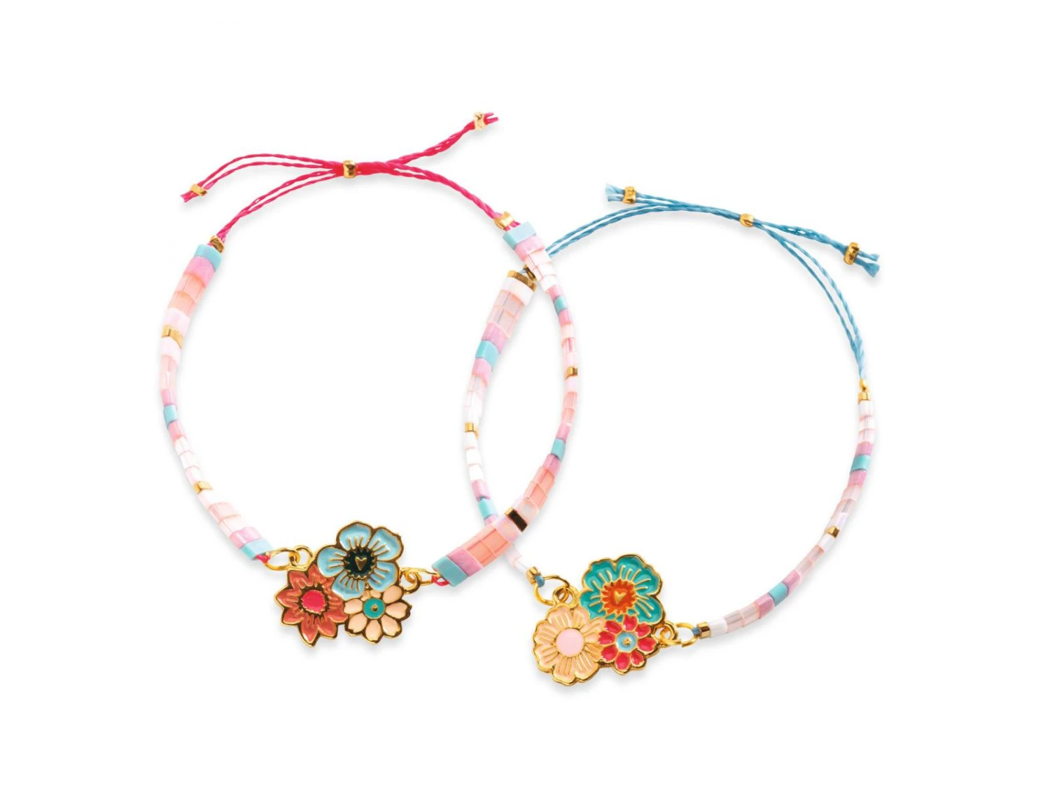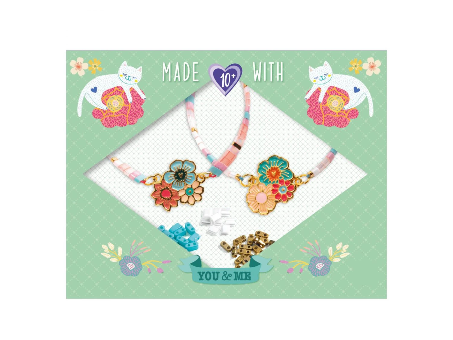 Dans une jolie boîte brillante, un assortiment de perles et de charms fleurs pour créer 2 bracelets aux couleurs printanières. 2 bijoux à conserver ou à offrir dans un joli sac en organza. Et pour encore plus de souvenirs, deux cartes illustrées sont incluses pour inscrire des mots doux.