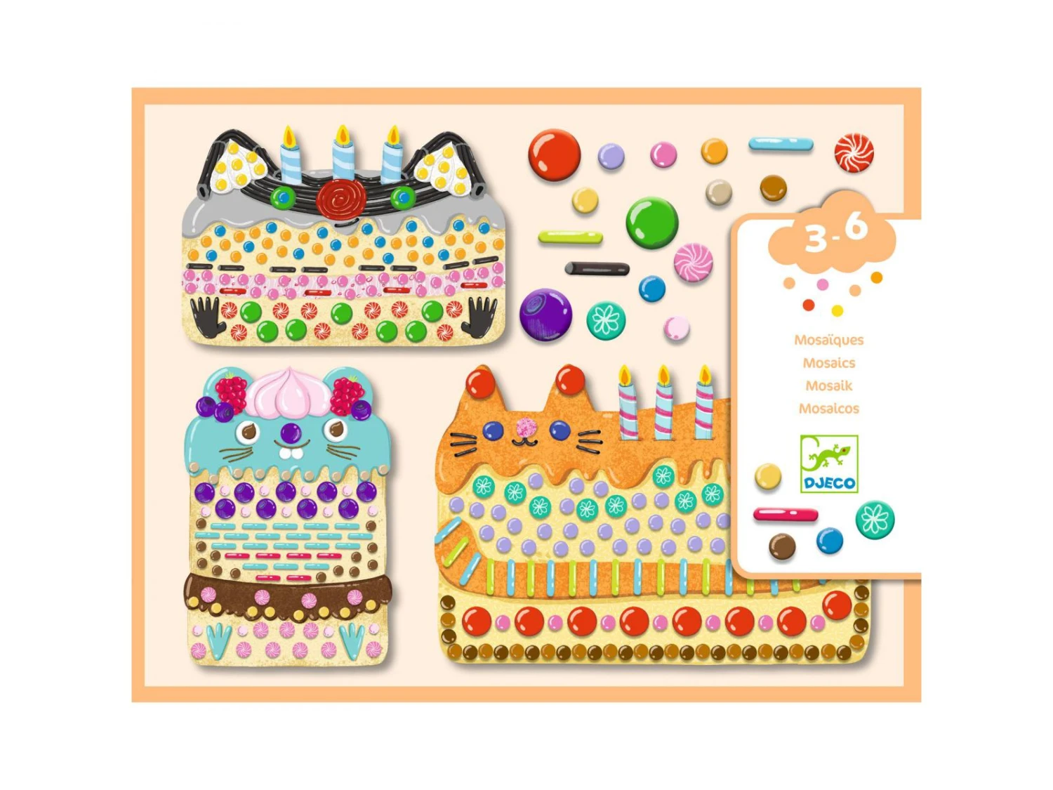 Une activitĂ© de collage pour crĂ©er des gâteaux trop mignons et s’initier Ă la mosaĂŻque. En suivant le livret explicatif, l’enfant colle les gommettes colorĂ©es et illustrĂ©es pour dĂ©corer 3 dĂ©lices silhouettĂ©s.