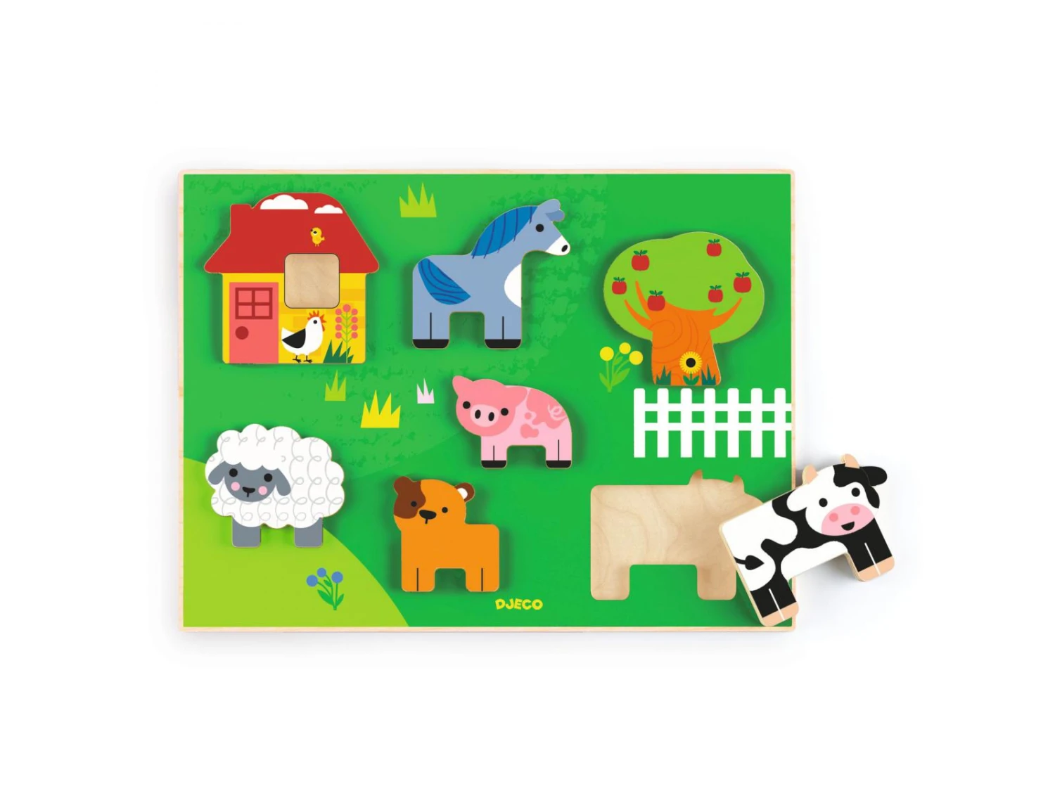 Farm Story est un puzzle en bois sur le thème de la ferme. Les pièces Ă©paisses tiennent debout et permettent Ă l’enfant de s’amuser avec les animaux et le dĂ©cor.