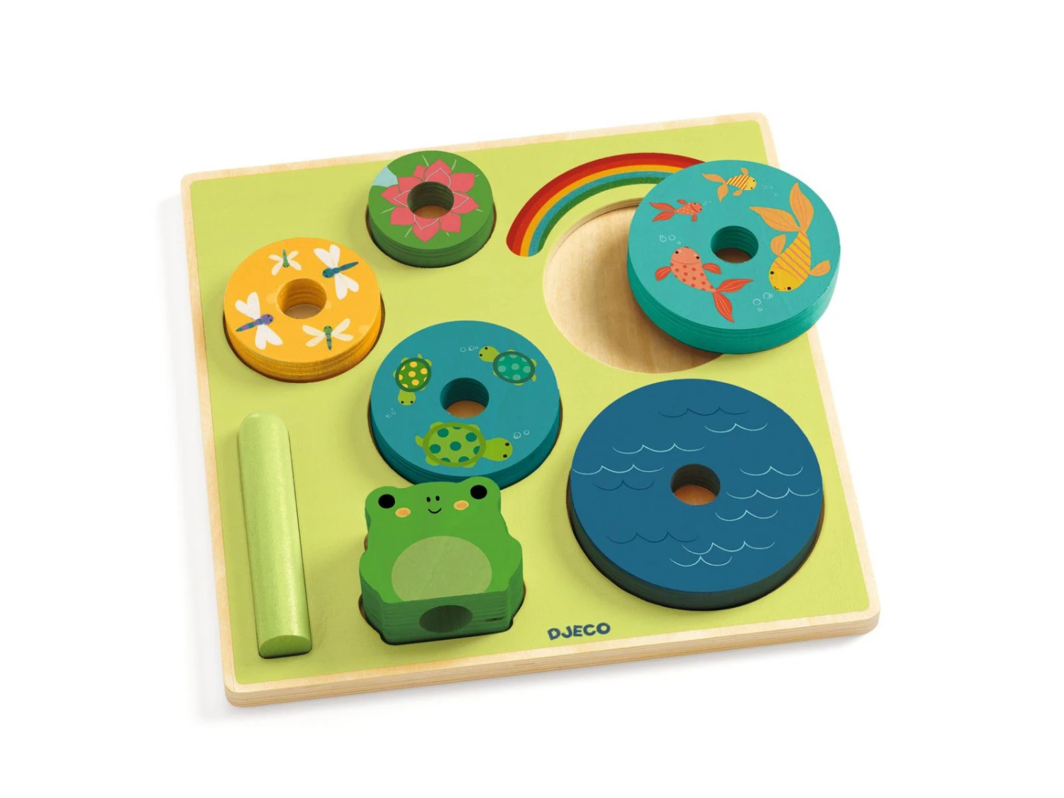 Puzz & Stack est un puzzle en bois facile Ă assembler et un jeu d’empilage. Les pièces s’empilent sur l’axe en bois pour former une jolie pyramide de fleurs avec une petite grenouille sur le dessus.