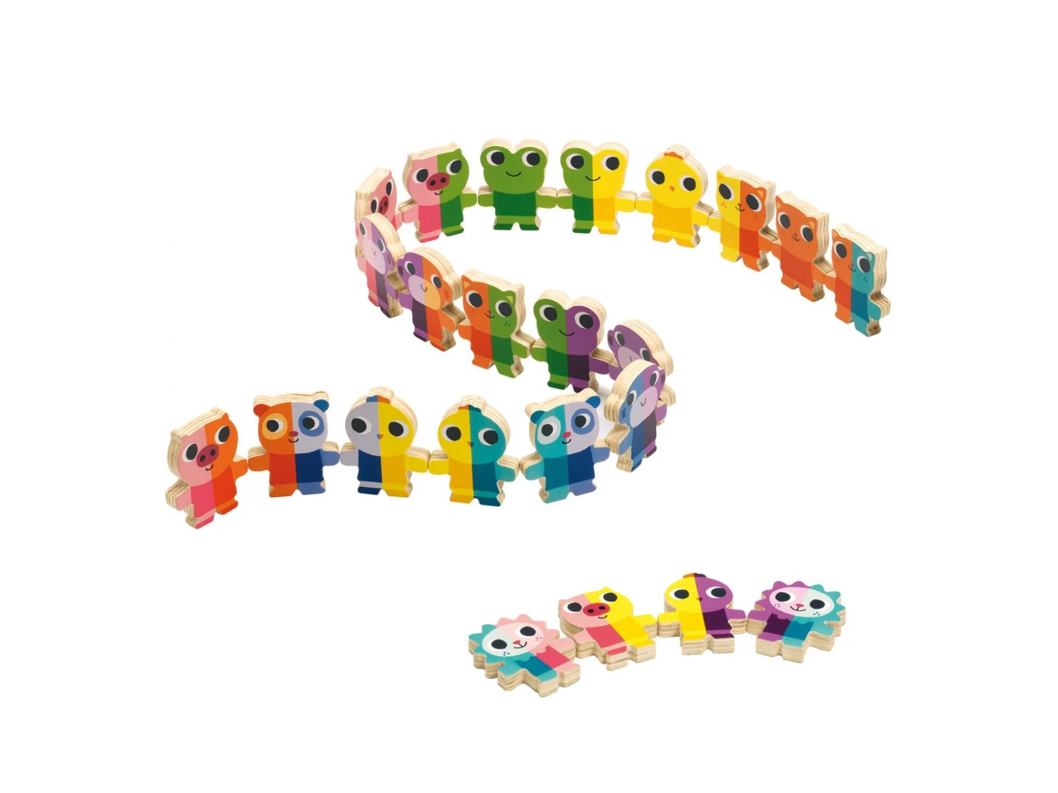 Un jeu de dominos en forme d’animaux colorés dès 3 ans. L’enfant associe les dominos en bois en suivant les couleurs pour former une suite colorée.