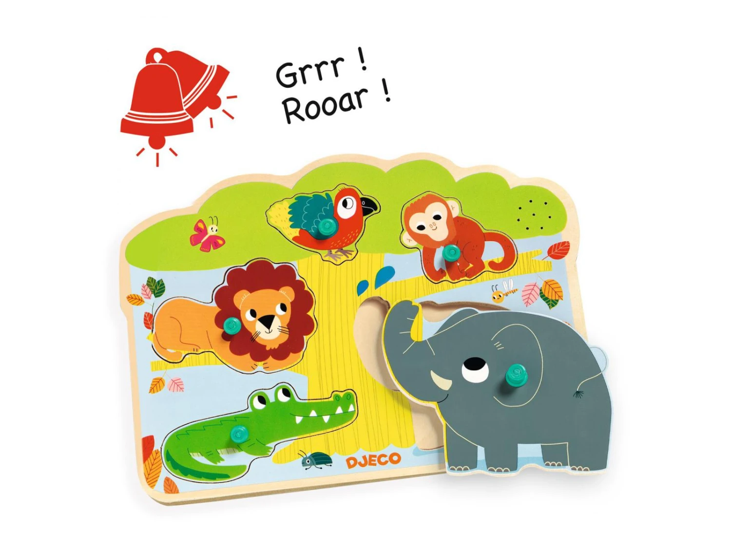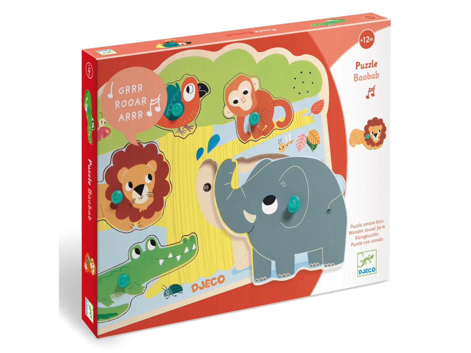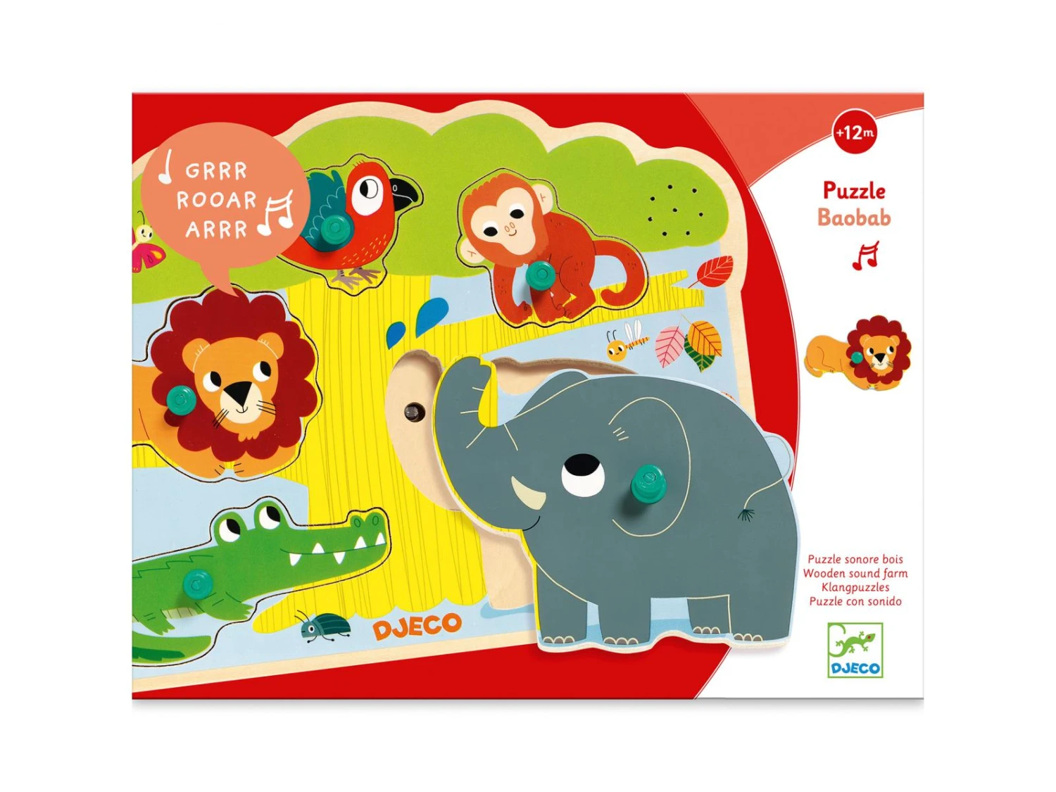 Baobab est un puzzle d’encastrement sonore en bois sur le thème de la savane.