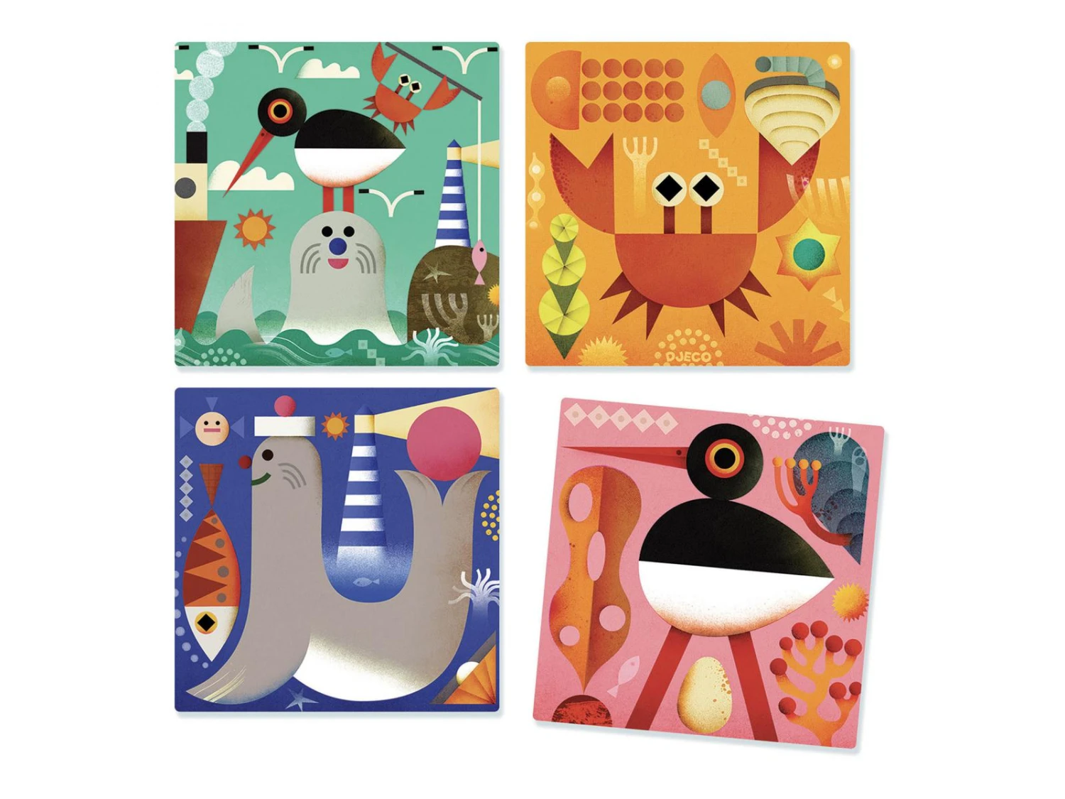 4 puzzles sur le thème des animaux marins. Les 9 cubes en bois s’enfilent sur 3 tiges verticales pour aider l’enfant Ă les placer correctement.