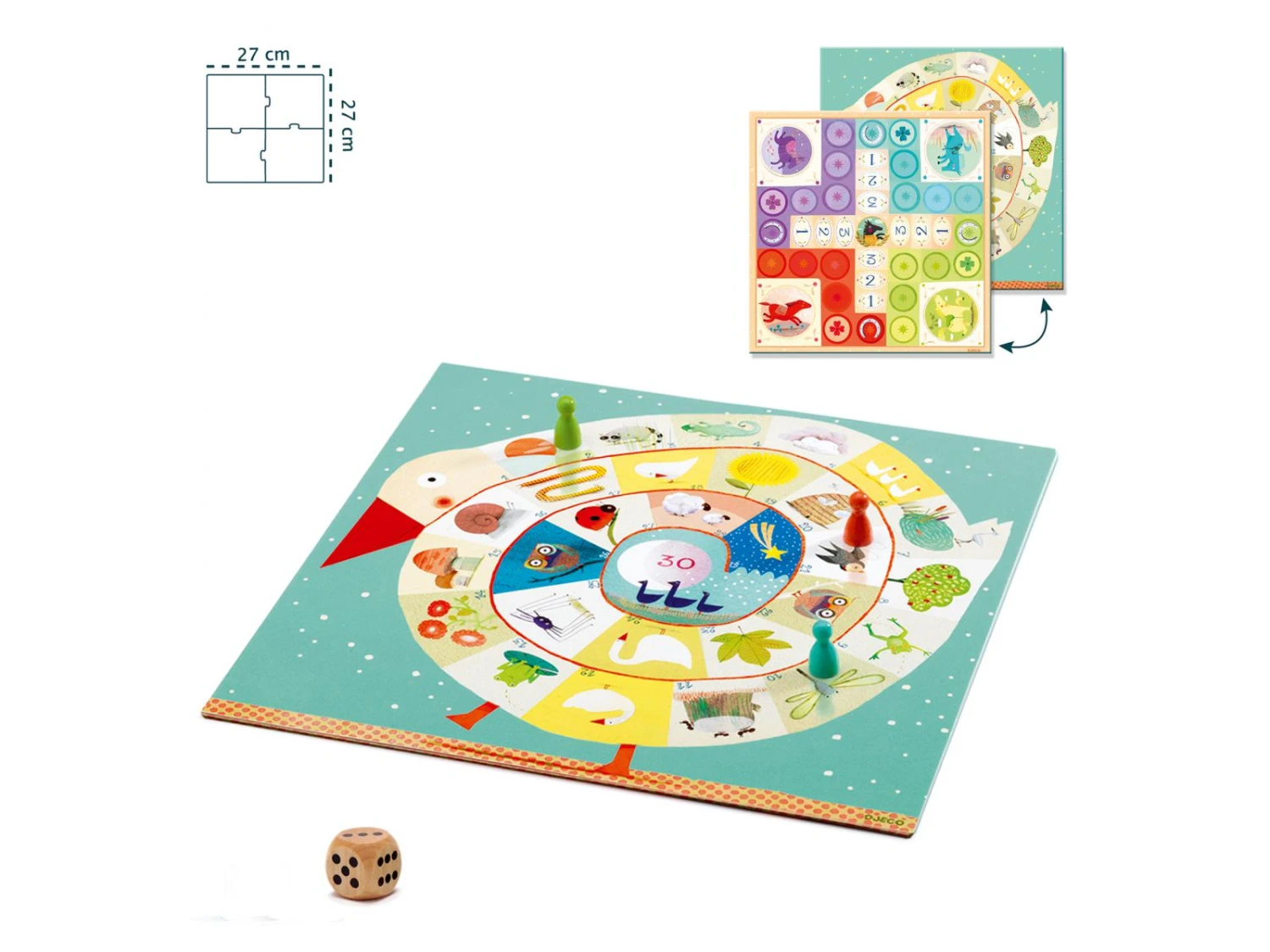 Une mallette contenant un jeu de l’oie et un jeu de petits chevaux aux circuits simplifiés adaptés aux plus petits dès 3 ans.