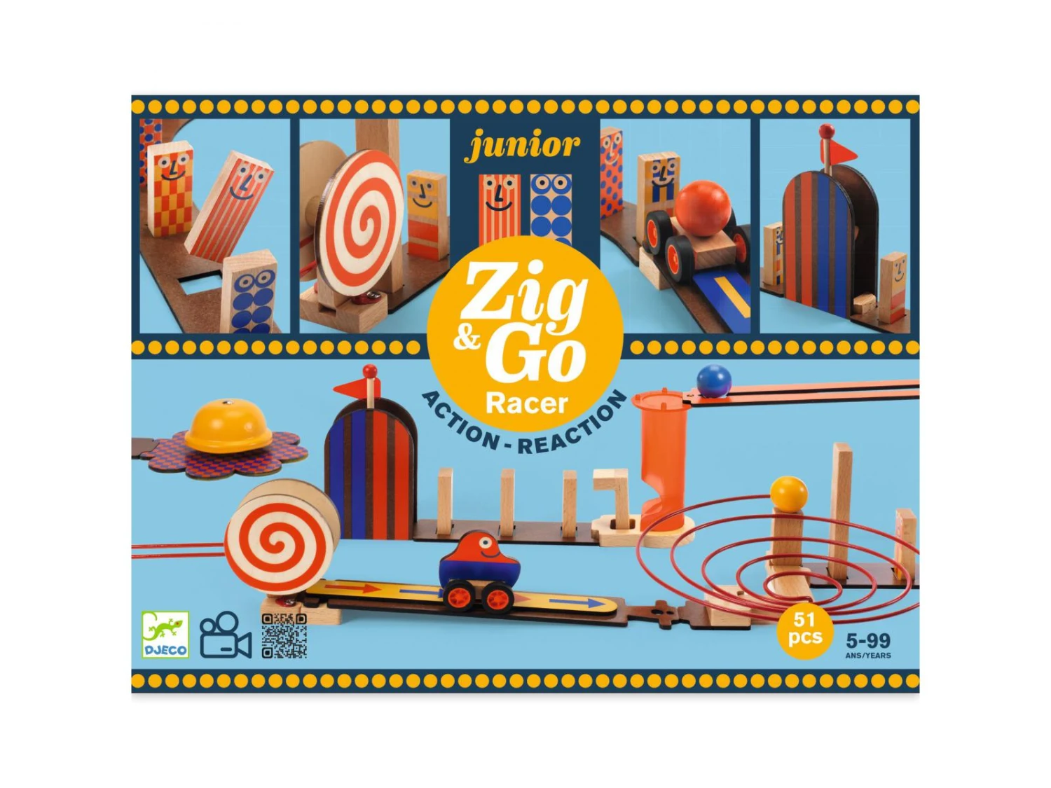 Racer est un jeu de rĂ©action en chaĂ®ne, de rĂ©flexion et de construction en bois pour les enfants Ă partir de 5 ans. L’enfant suit les 3 modèles du livret pour construire son parcours ou en imagine d’autres Ă l’infini. Un contenu Ă©poustouflant avec de drĂ´les de dominos Zig qui reprĂ©sentent des bonhommes. Ce jeu est compatible avec tous les coffrets de la collection pour inventer des parcours action-rĂ©action encore plus ingĂ©nieux !