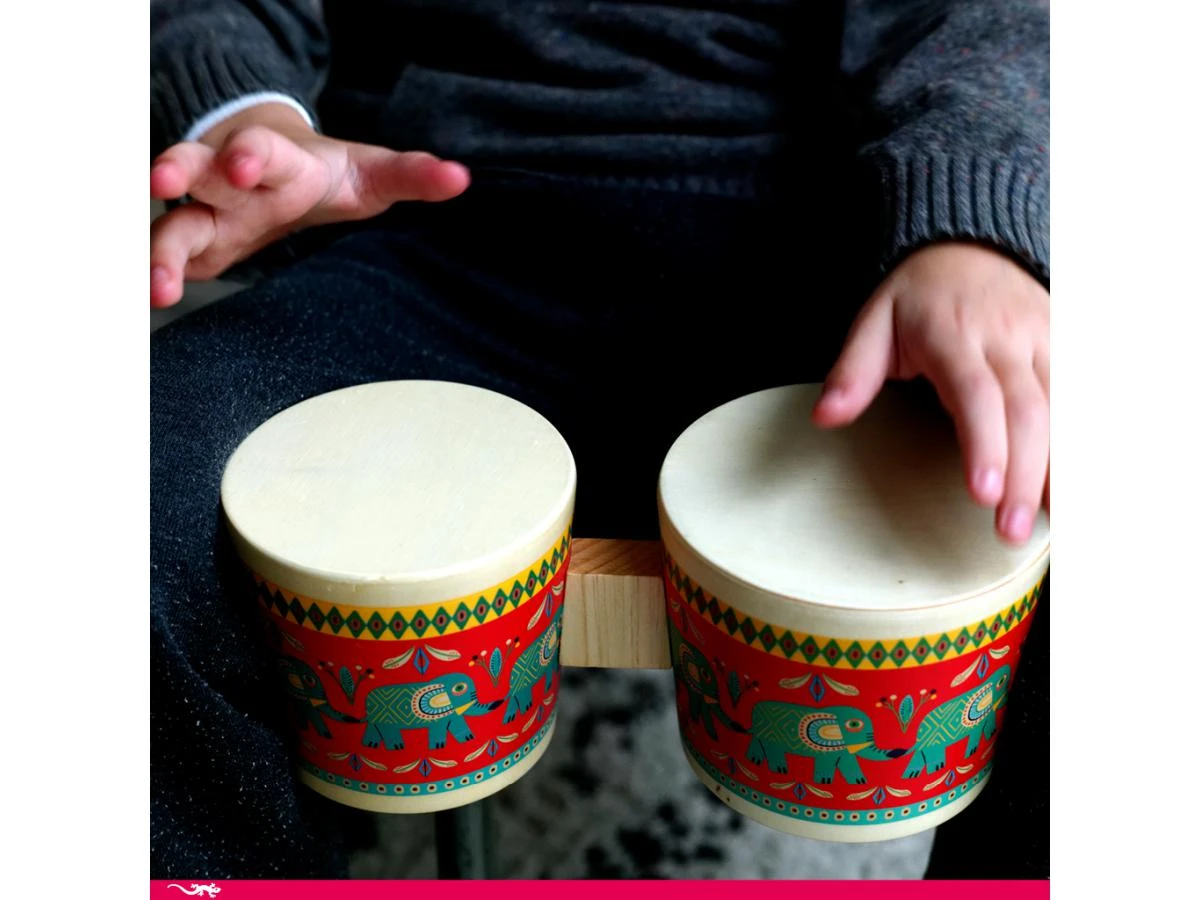 Un magnifique bongo tout en bois sur lequel est illustrĂ©e une frise d’Ă©lĂ©phants colorĂ©s. L’enfant vient taper avec ses paumes de mains ou ses doigts sur les deux caisses de rĂ©sonnance qui doivent ĂŞtre libres. Le cadeau idĂ©al pour les petits musiciens dès 3 ans.