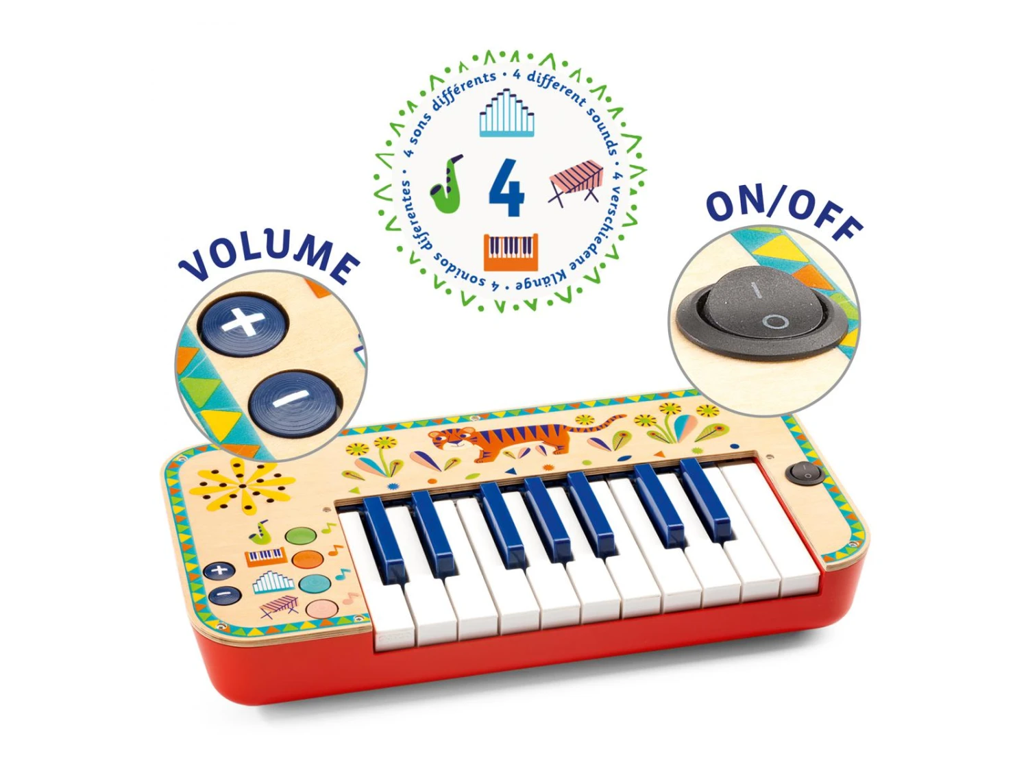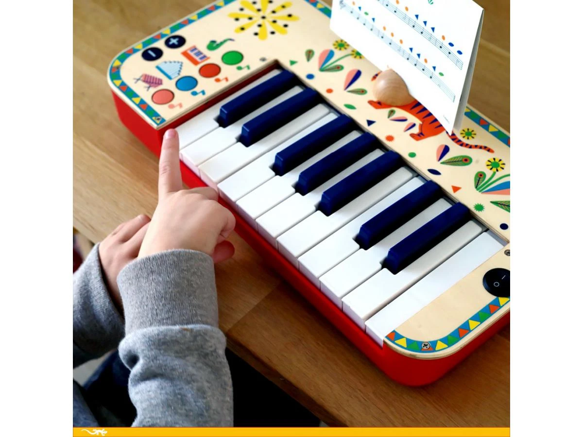 Un magnifique synthĂ©tiseur Ă©lectronique en bois destinĂ© aux enfants et joliment illustrĂ©. A l’aide des partitions, l’enfant pourra jouer 4 chansons populaires ou composer d’autres morceaux Ă sa guise. Chaque note est remplacĂ©e par un signe colorĂ© imprimĂ© devant les touches du piano : il suffit de suivre les mĂŞmes signes colorĂ©s sur la partition pour jouer et s’Ă©veiller Ă la musique, dès 3 ans. Fonctionne 4 piles AA (non fournies).