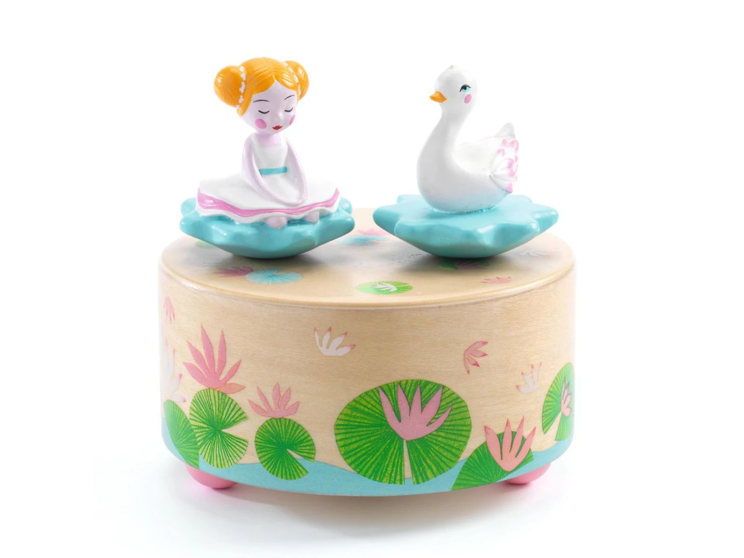 Ballerina Melody est une boîte à musique magnétique ronde joliment illustrée avec deux jolies figurines ballerine et cygne. Il suffit de remonter la clé et les figurines se mettent à tourner et à danser au son de la mélodie “Le lac des cygnesde Piotr Ilitch Tchaïkovski.