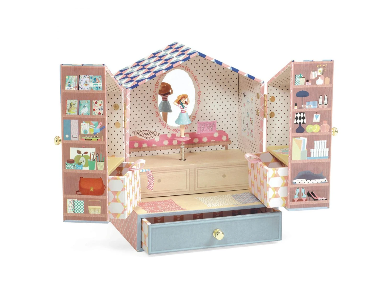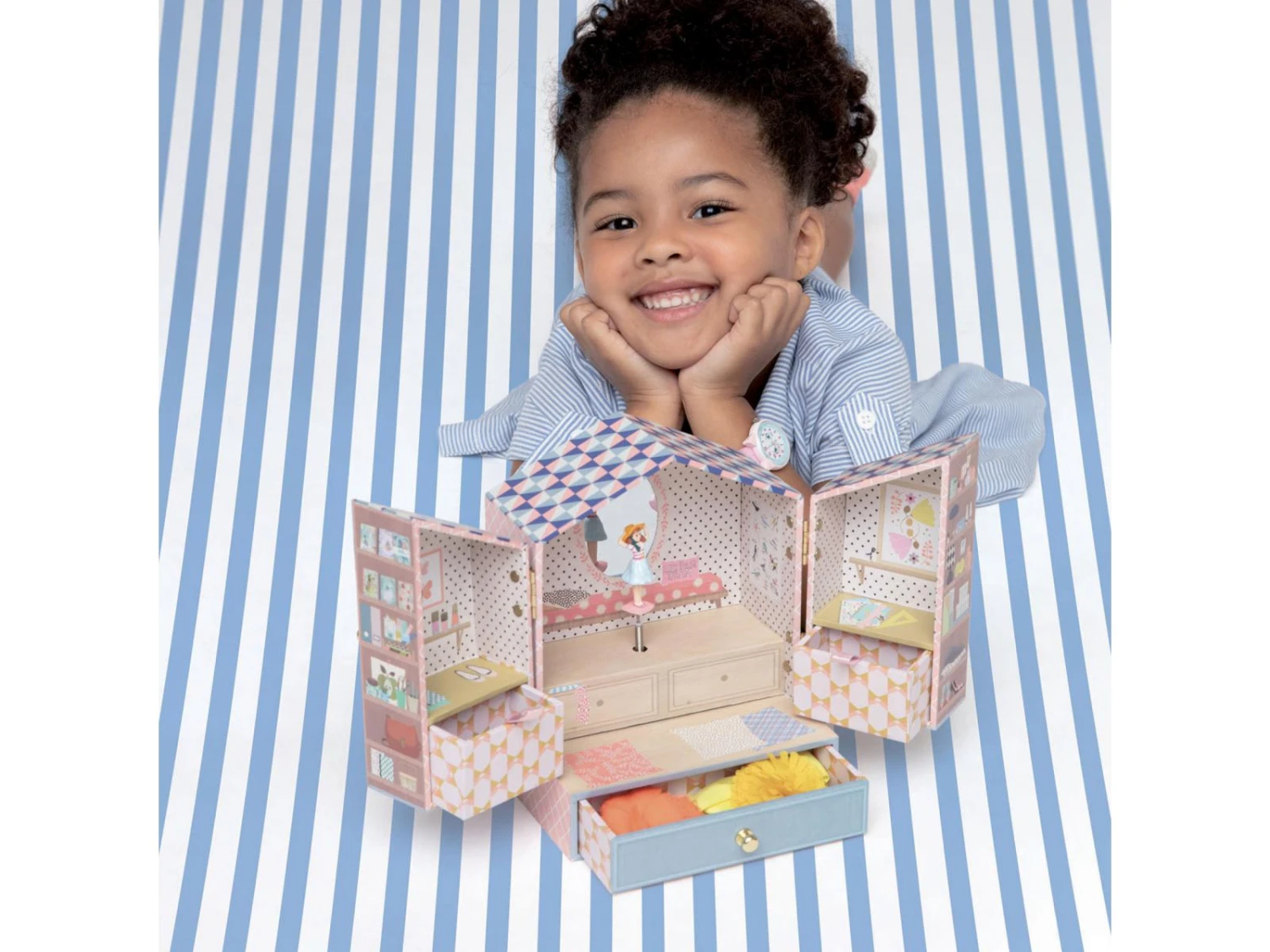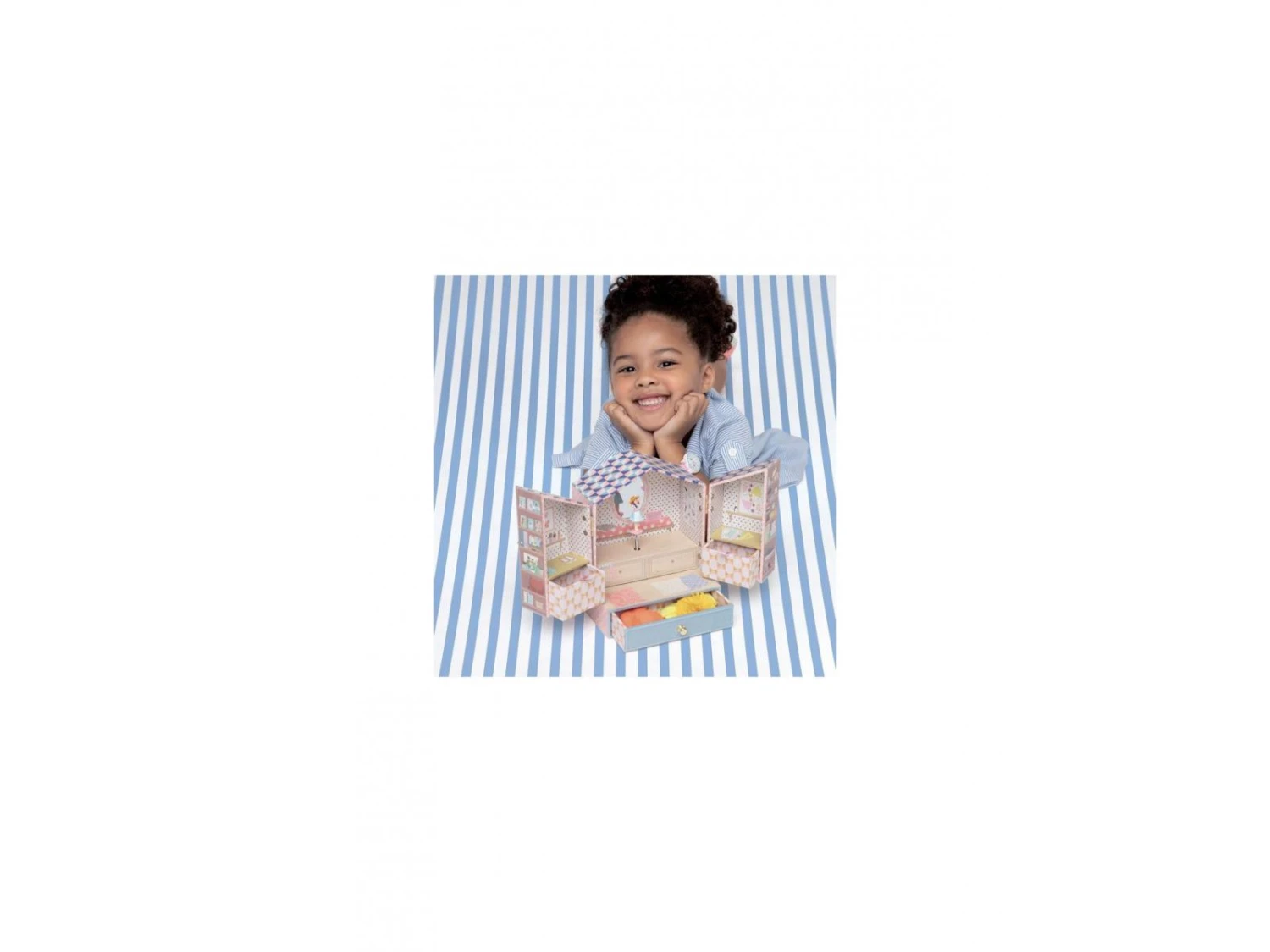 Tinou Shop est une boîte à musique joliment illustrée avec trois tiroirs pour ranger ses bijoux et secrets. Tournez la manivelle, ouvrez les portes de ce joli magasin, et surprise ! Une fillette finement sculptée tourne et se reflète sur un miroir silhouetté au son de la musique « La flûte enchantée » de Wolfgang Amadeus Mozart.