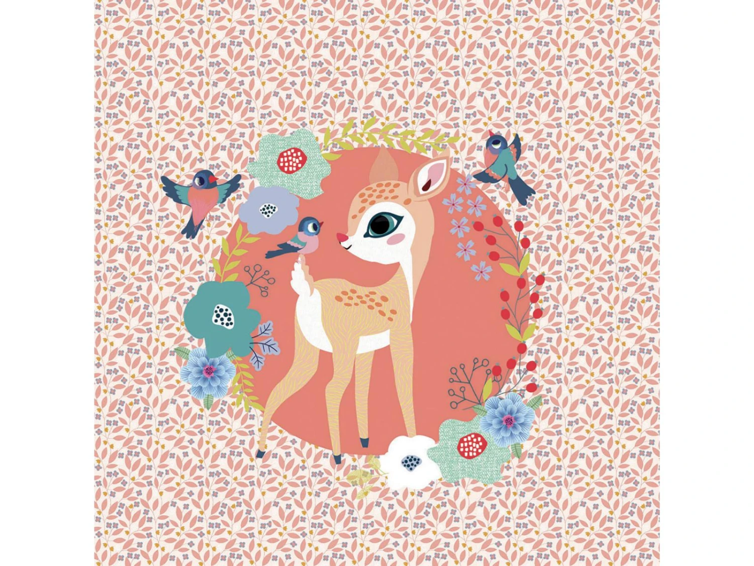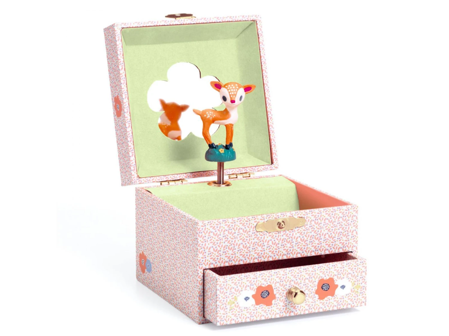 Faon des bois est une boîte à musique joliment illustrée avec un tiroir pour ranger ses bijoux et secrets. Tournez la manivelle, ouvrez la boîte, et surprise ! Un faon finement sculpté tourne et se reflète sur un miroir silhouetté au son de la musique « La flûte enchantée » de Wolfgang Amadeus Mozart.