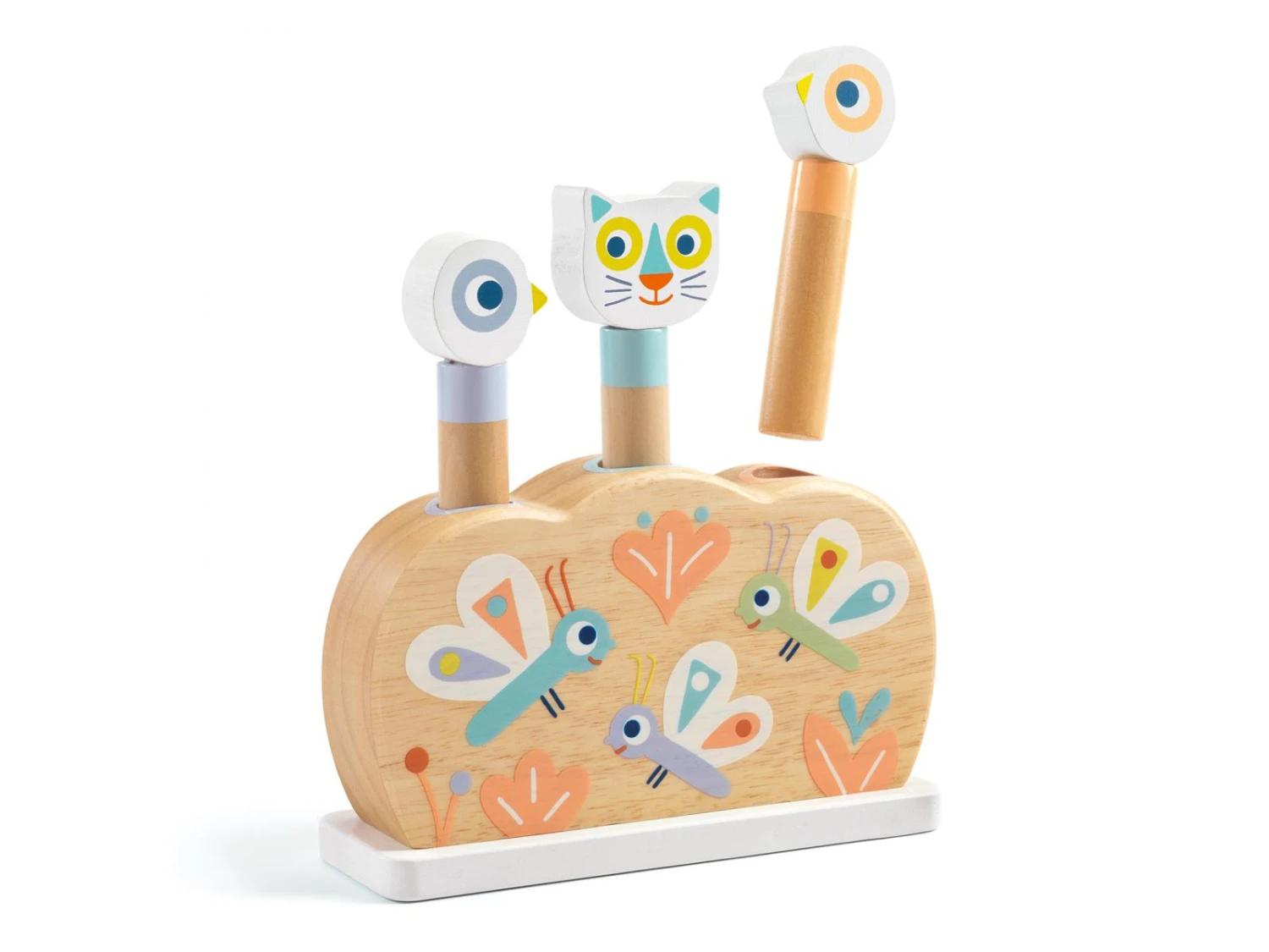 Un jouet pop-up en bois naturel et aux couleurs pastel, destiné aux tout-petits dès 12 mois. Un socle joliment illustré et trois bâtonnets « animaux » à placer dans les trous pour les faire bondir.