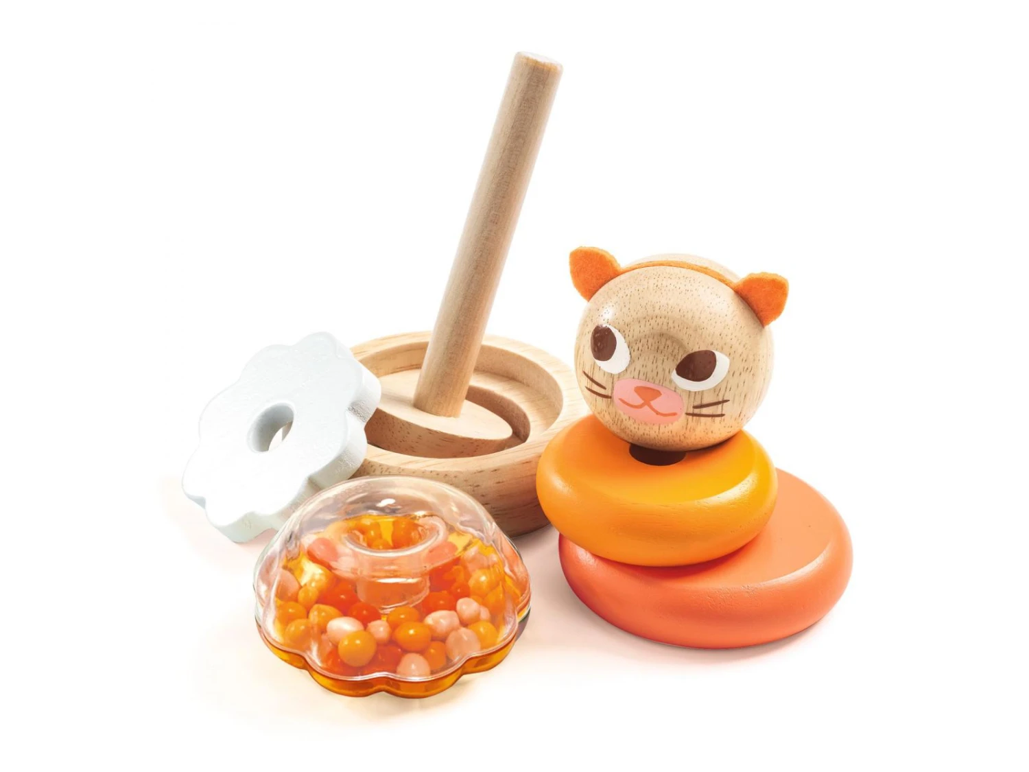 Un jeu d’empilage en bois pour reproduire un chat avec les 4 anneaux. L’enfant empile dans l’ordre les disques du plus grand au plus petit et ajoute la tête du chat pour terminer son animal. Une surprise à découvrir sous le plus grand des anneaux.