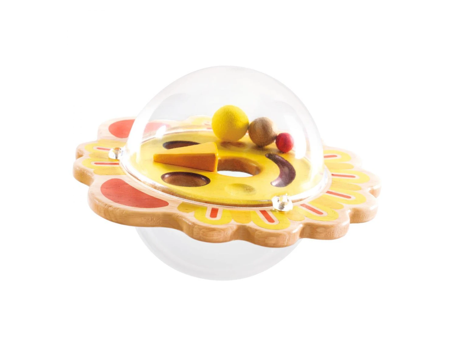 Piti Wizi est un jeu de manipulation pour les petits. AppuyĂ© sur une table, l’enfant fait basculer la balle pour diriger facilement les billes autour des murets et vers le trou afin de les faire disparaĂ®tre, puis recommence de l’autre cĂ´tĂ© avec une image diffĂ©rente.