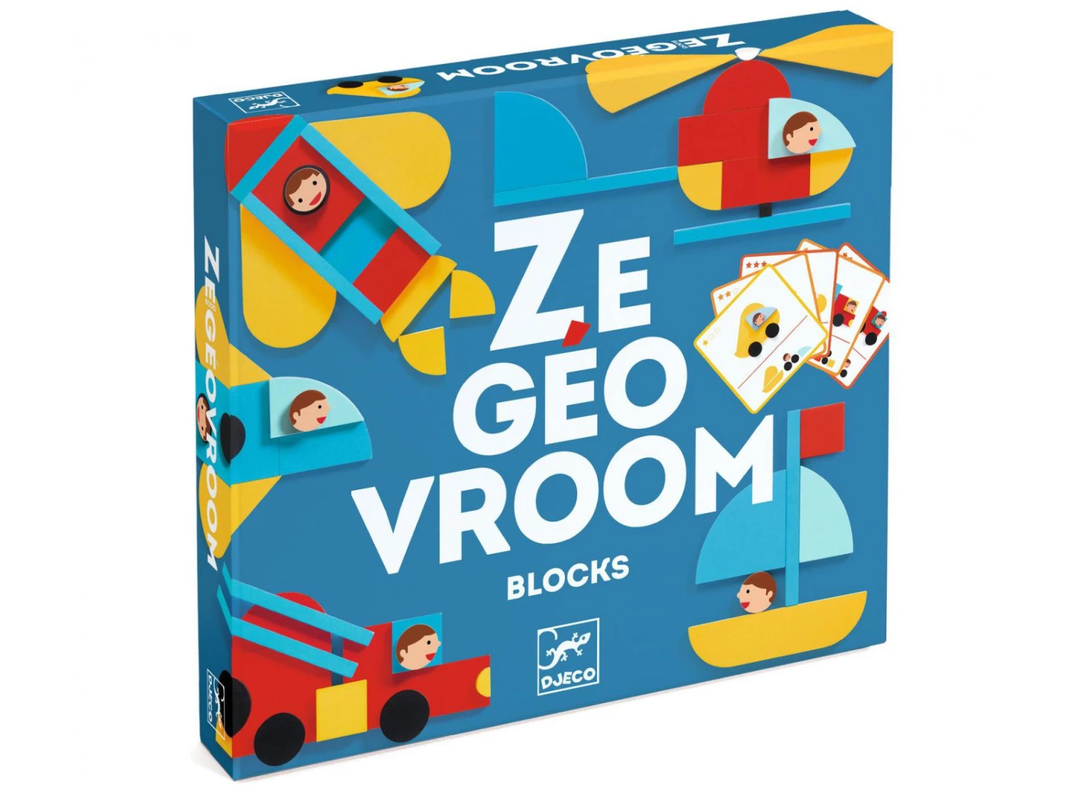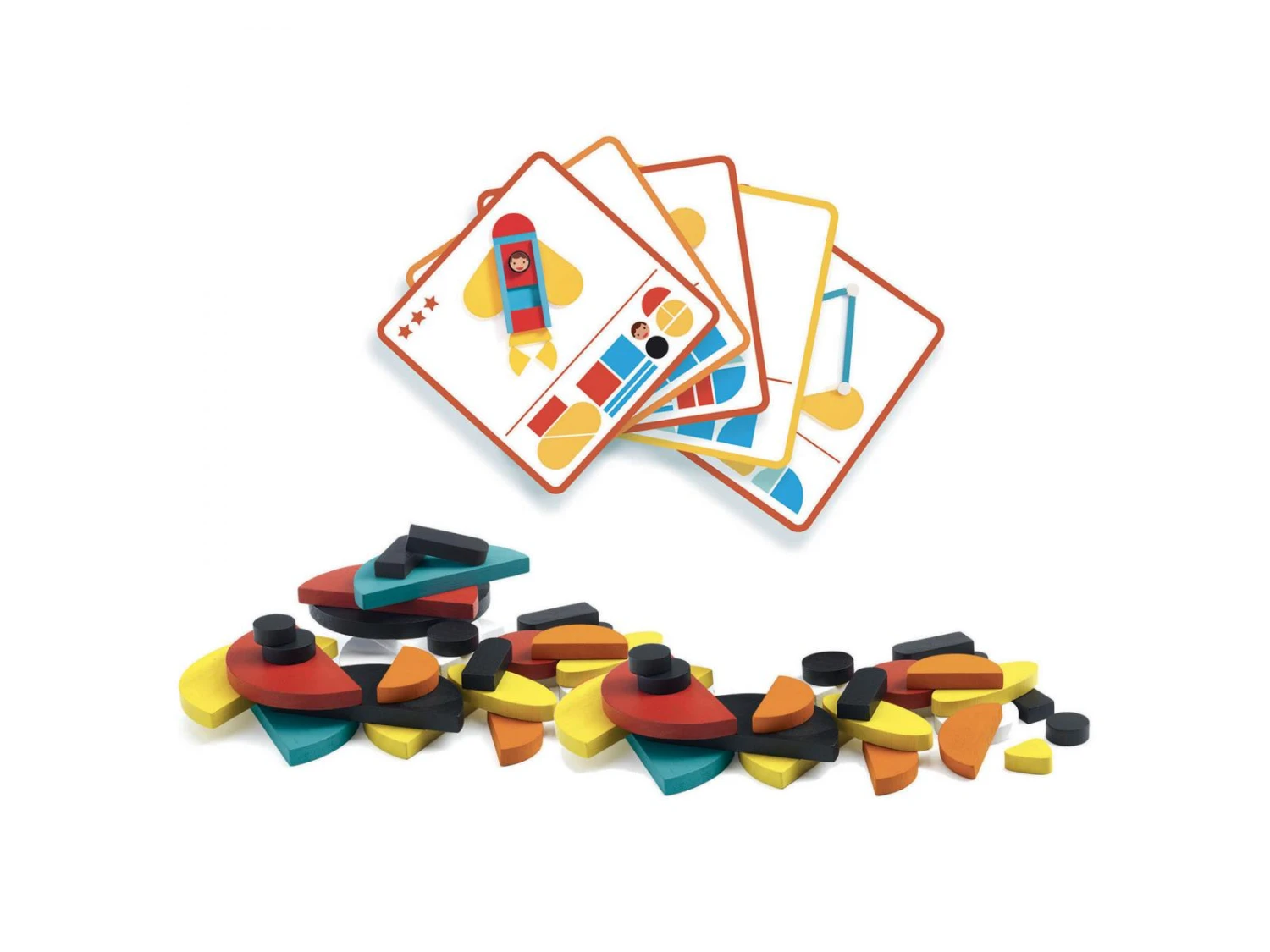 Un jeu de construction en bois pour crĂ©er des vĂ©hicules colorĂ©s. L’enfant utilise les pièces en bois en les plaçant cĂ´te Ă cĂ´te ou en les superposant pour reproduire les vĂ©hicules des cartes modèle.