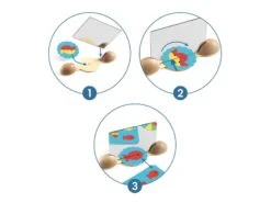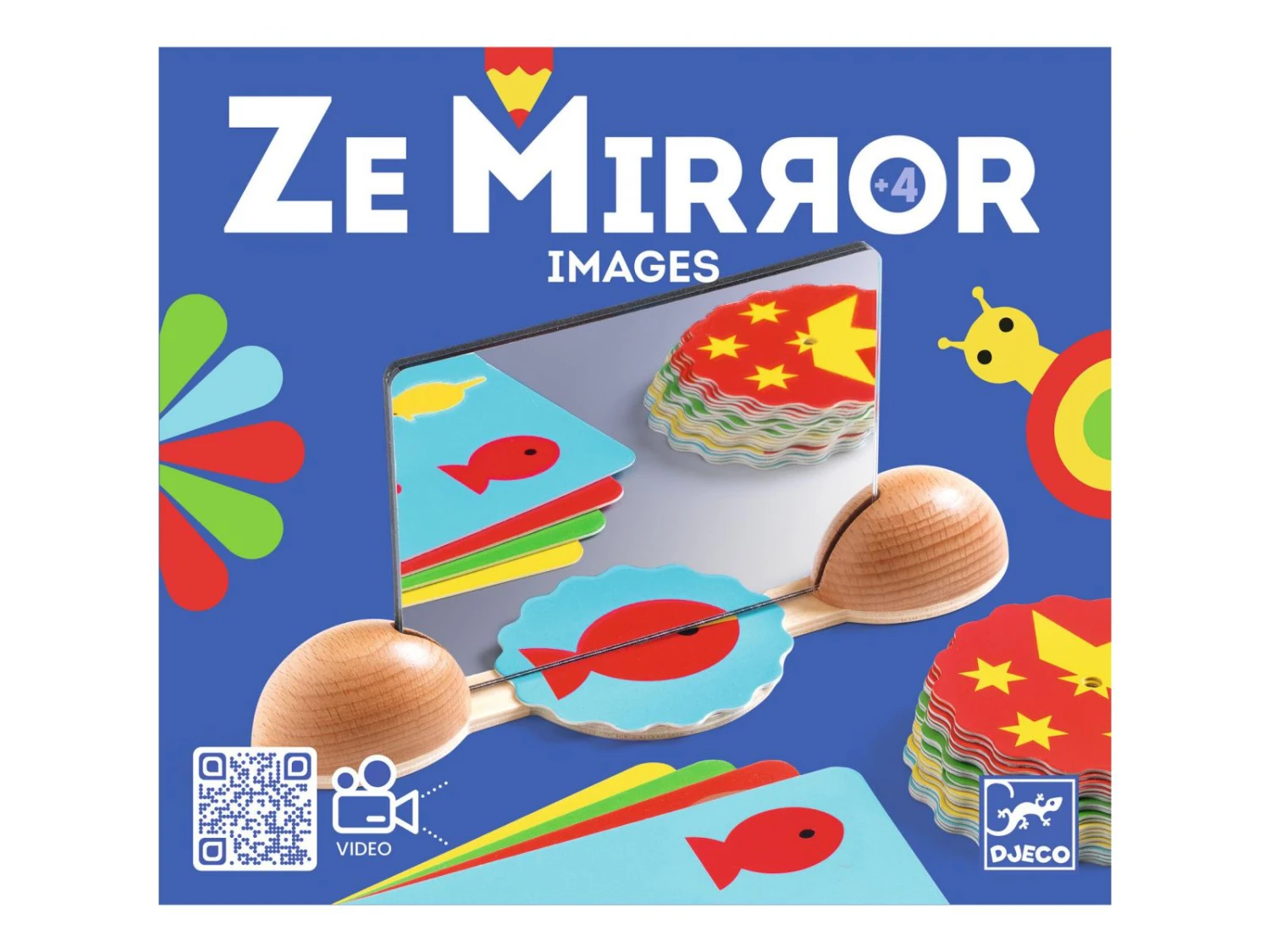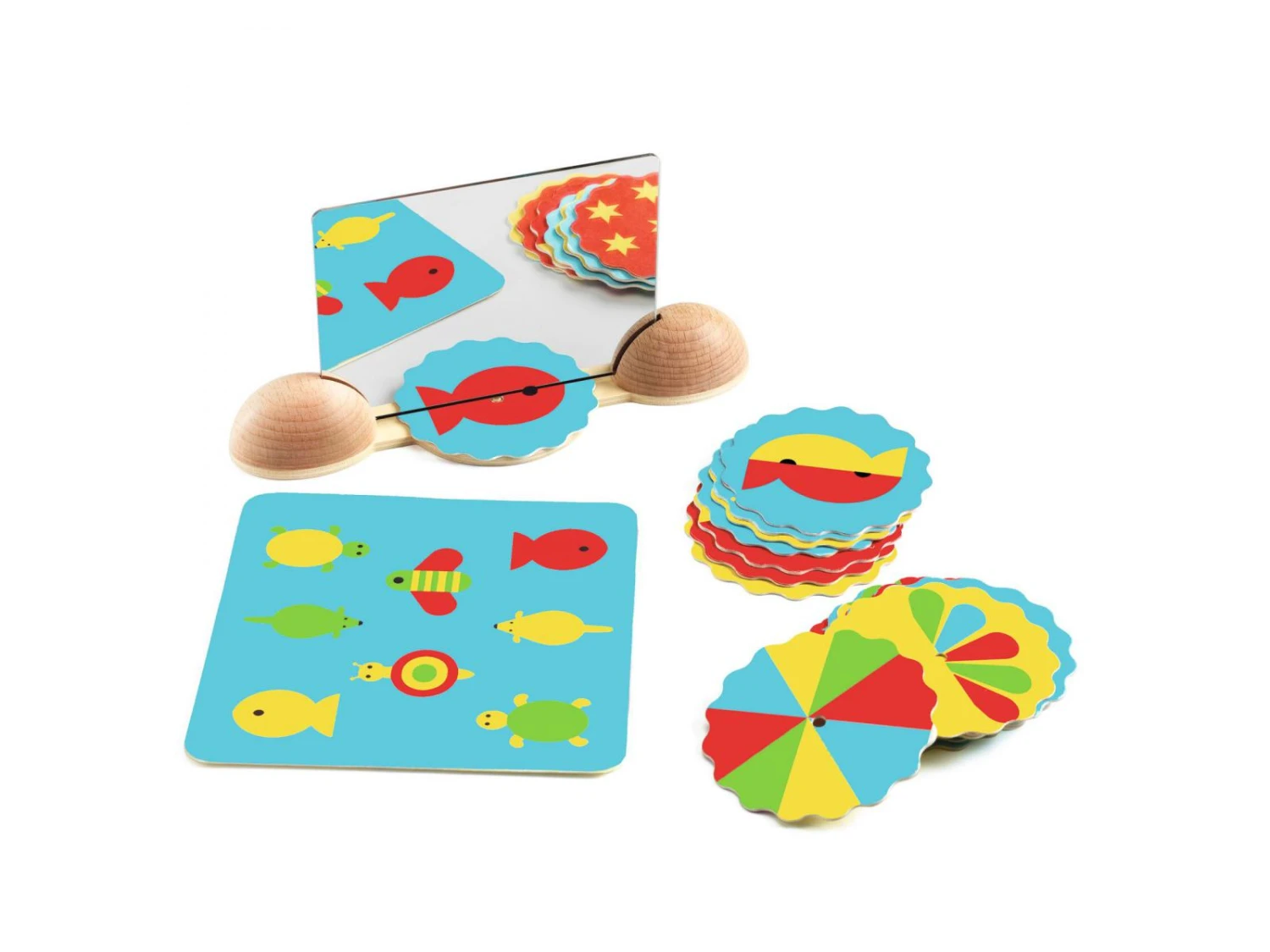 Dans ce coffret dĂ©couverte, l’enfant place l’image sous le miroir et la tourne jusqu’Ă ce qu’il trouve l’une des images prĂ©sentes sur les cartes.