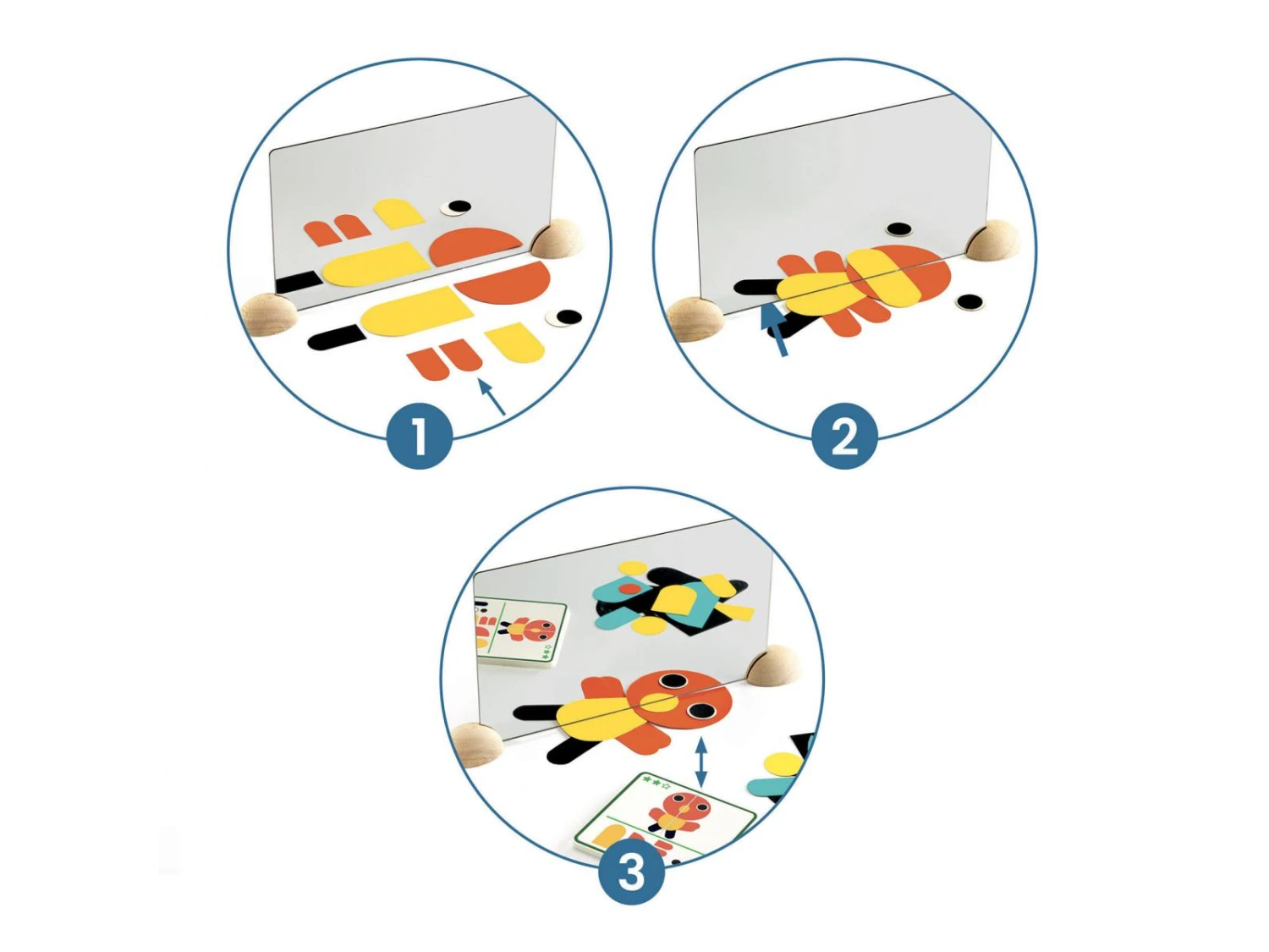 L’enfant reproduit les diffĂ©rents animaux montrĂ©s sur les cartes exemples en glissant et superposant les formes en papier sous le miroir.