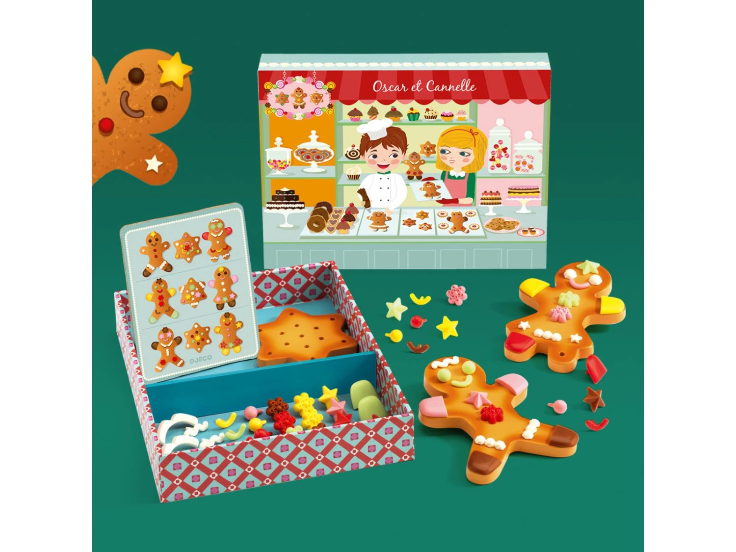 Oscar et Cannelle est une jolie boîte dans laquelle se trouvent trois petits gâteaux en pain d’épice, deux personnages et une étoile à venir décorer en suivant les modèles sur la carte ou selon son imagination.
