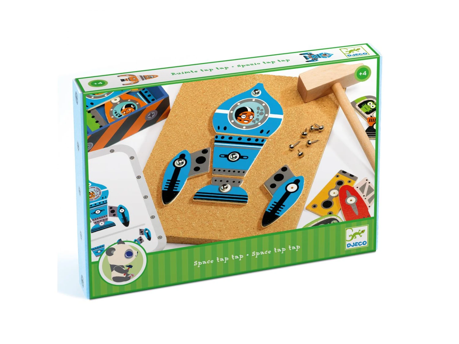 Tap tap Space, un classique des activitĂ©s de maternelle revisitĂ© par Djeco pour dĂ©velopper la dextĂ©ritĂ© des plus jeunes. L’enfant construit ses propres fusĂ©es et navettes spaciales en plaçant les pièces sur le support en liège et en les fixant Ă l’aide des petits clous et du marteau. Il reproduit les modèles ou fait appel Ă son imagination pour crĂ©er ses propres navettes spatiales Ă l’infini ! Le tout dans une jolie boĂ®te en bois !
