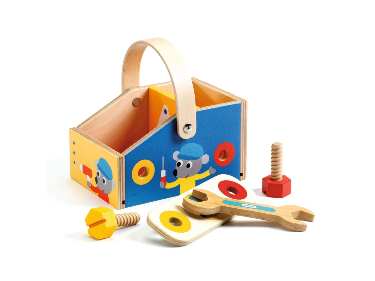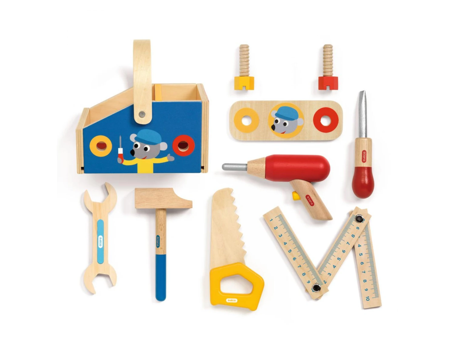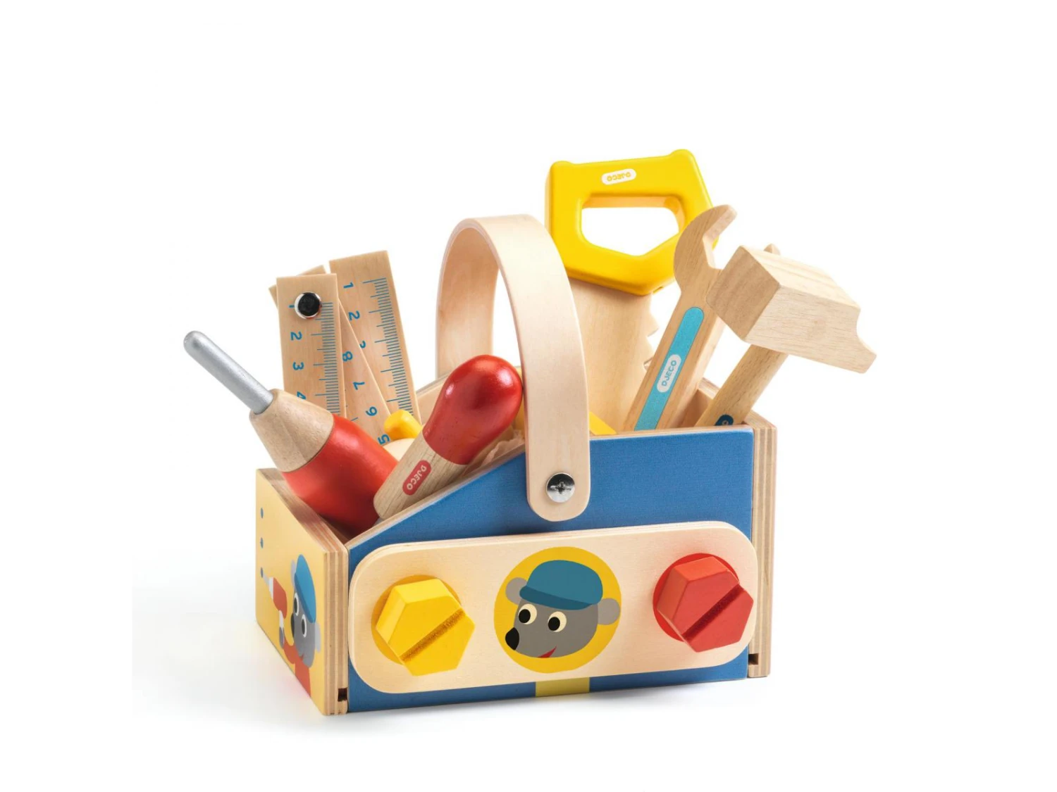 Une boîte à outils en bois ouverte, comme un panier, pour ranger et transporter facilement tous les outils. Un set de bricolage complet avec tous les accessoires indispensables au petit bricoleur.