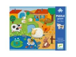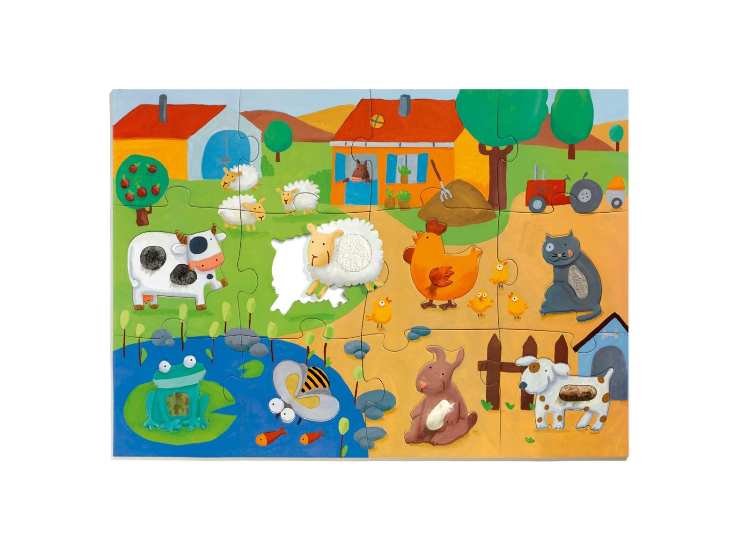 « Tactiloferme » est un puzzle géant tactile de 20 pièces. L’enfant assemble le puzzle et place chaque animal. Vache, chien, chat, lapin, grenouille, abeille, poule, mouton : à chacun son pelage.