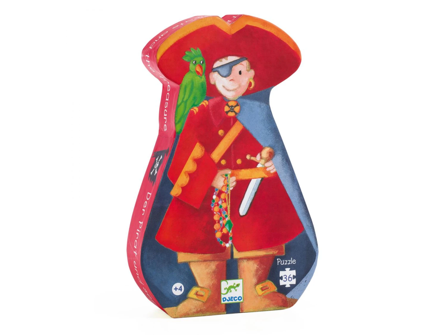 Un pirate part à la recherche du trésor accompagné de son perroquet. Un magnifique puzzle de 36 pièces dans une boîte élégante en forme de pirate.
