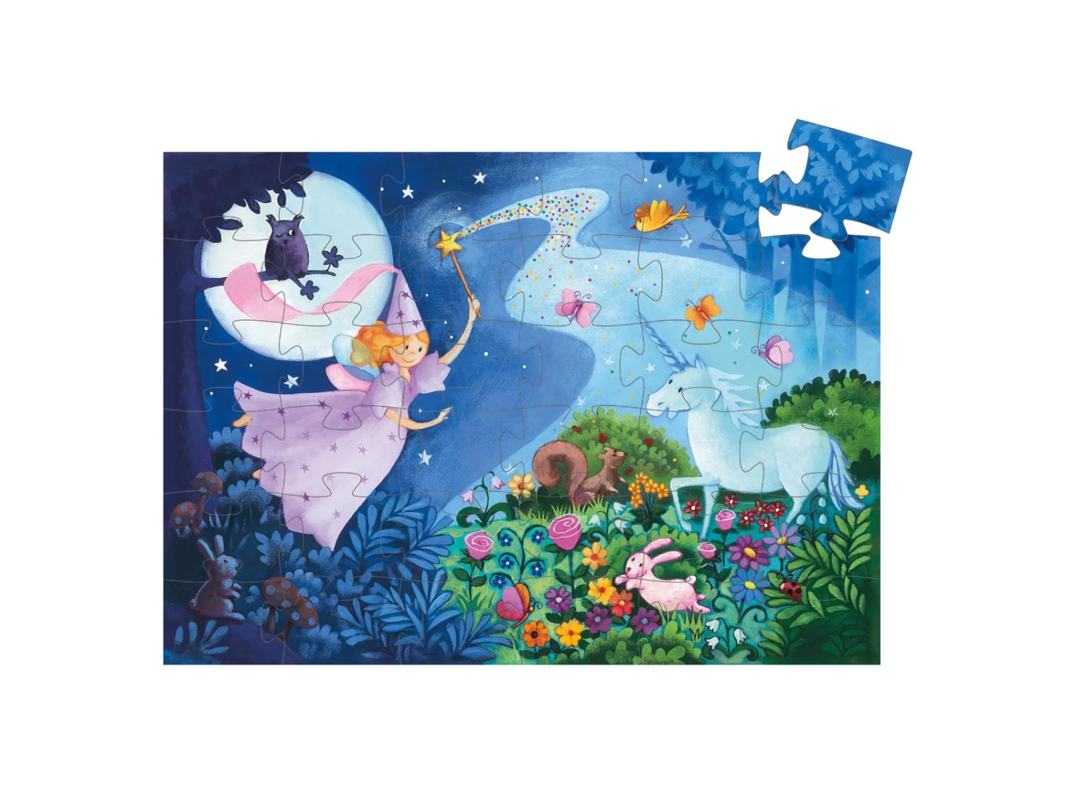 Quand la fée rencontre une licorne dans la nuit étincelante. Un magnifique puzzle de 36 pièces dans une boîte élégante en forme de fée.