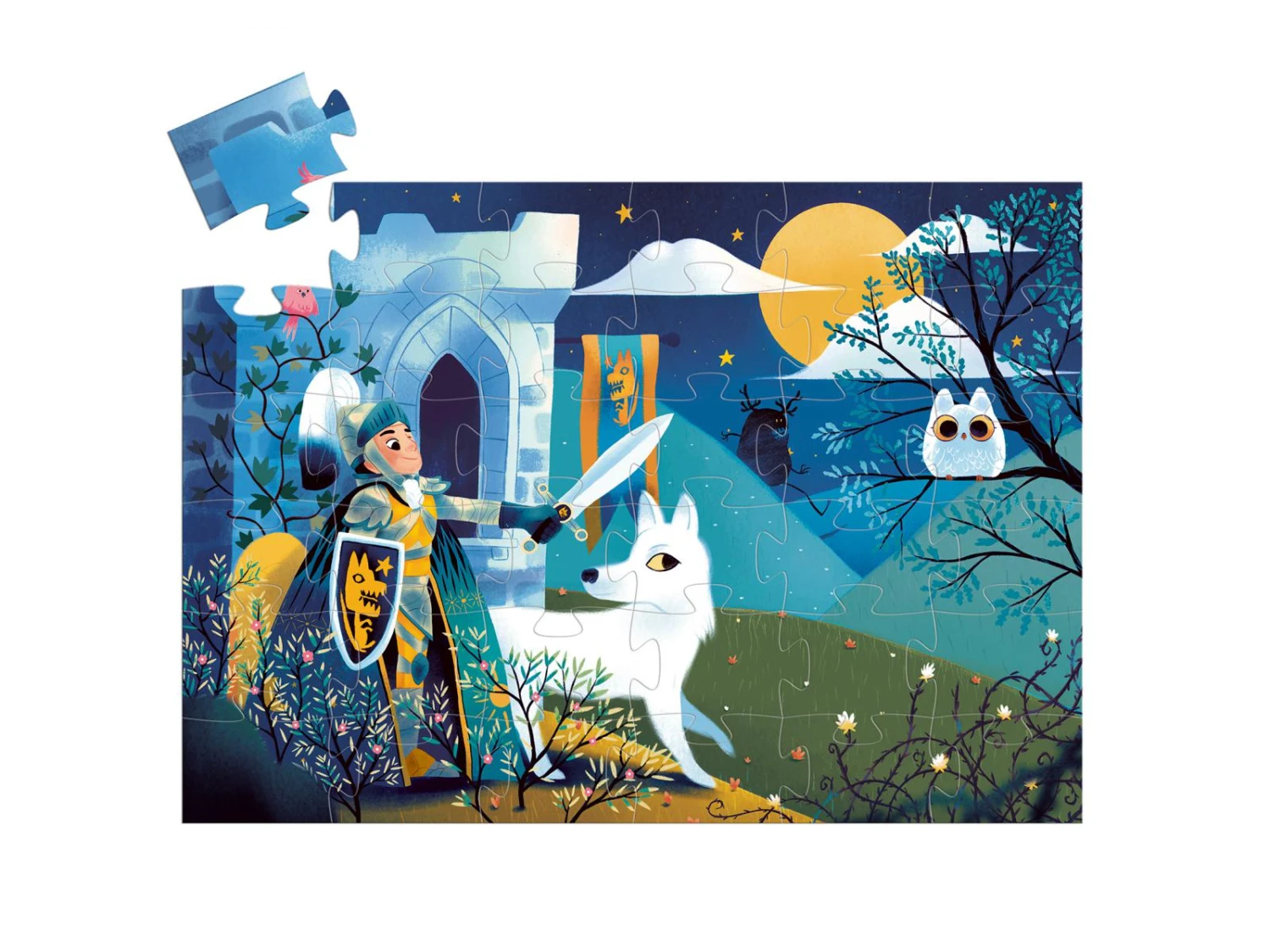 Un chevalier protège son château en compagnie de son loup un soir de pleine lune. Un magnifique puzzle de 36 pièces dans une boîte élégante en forme de chevalier.