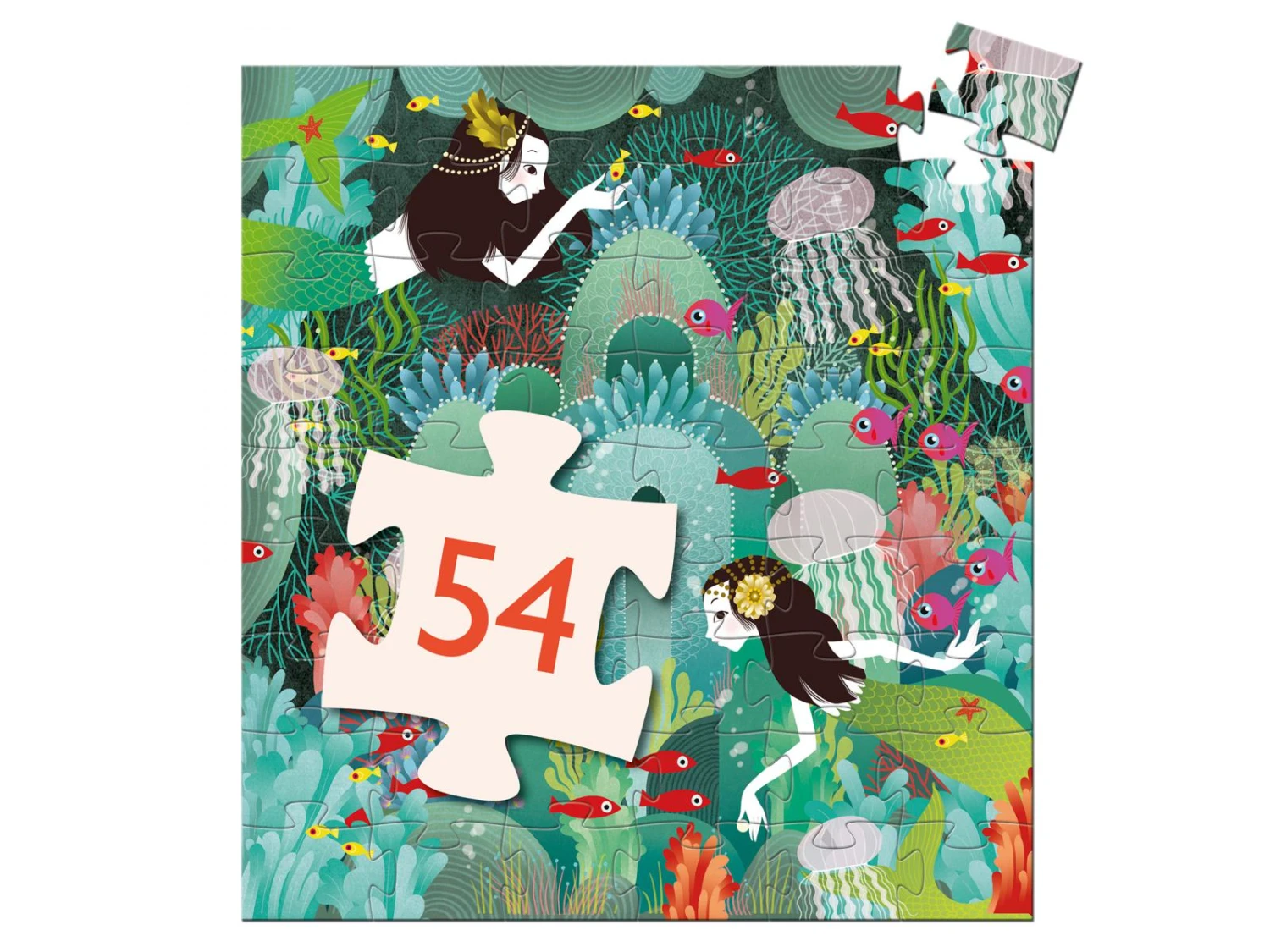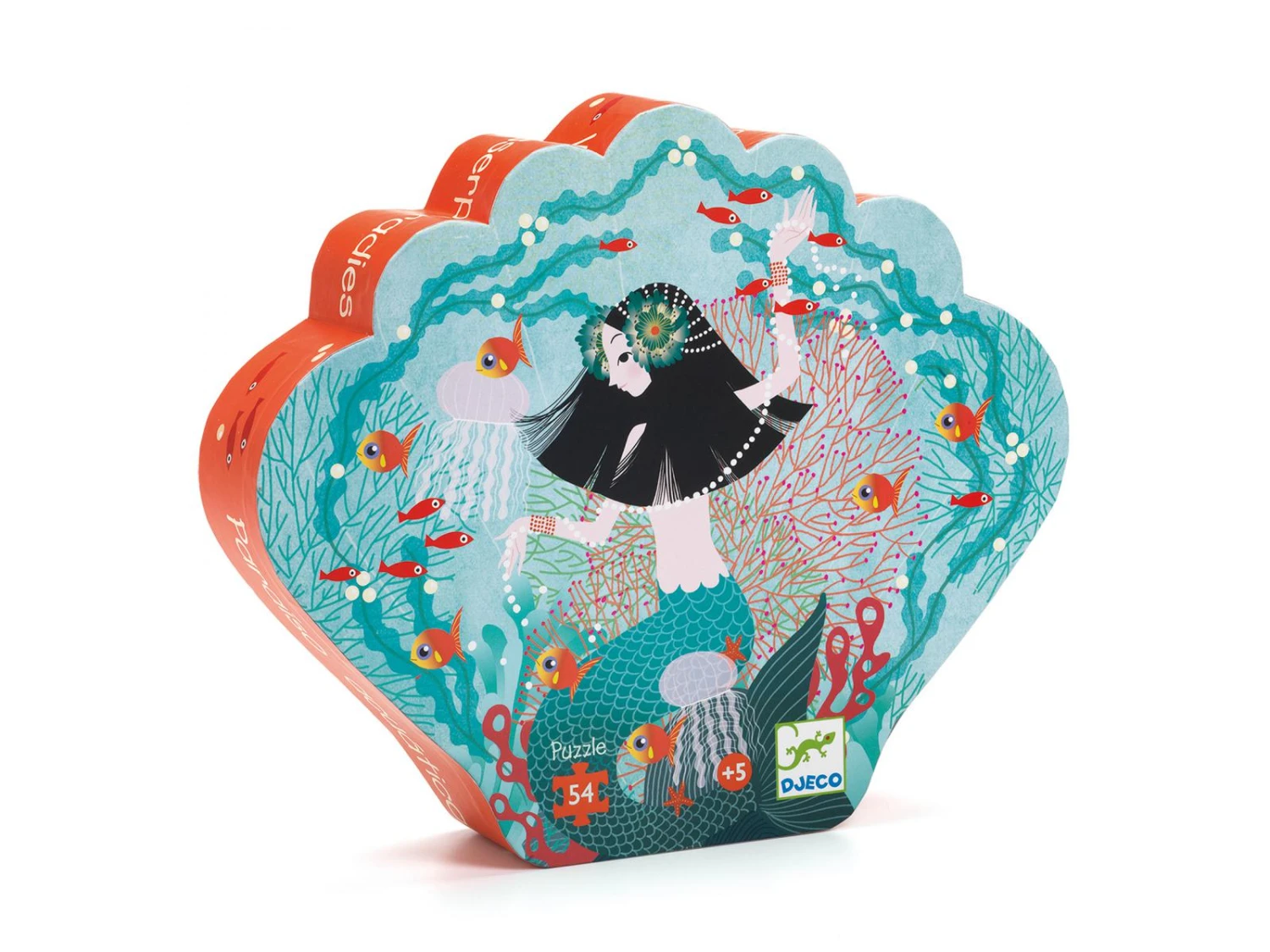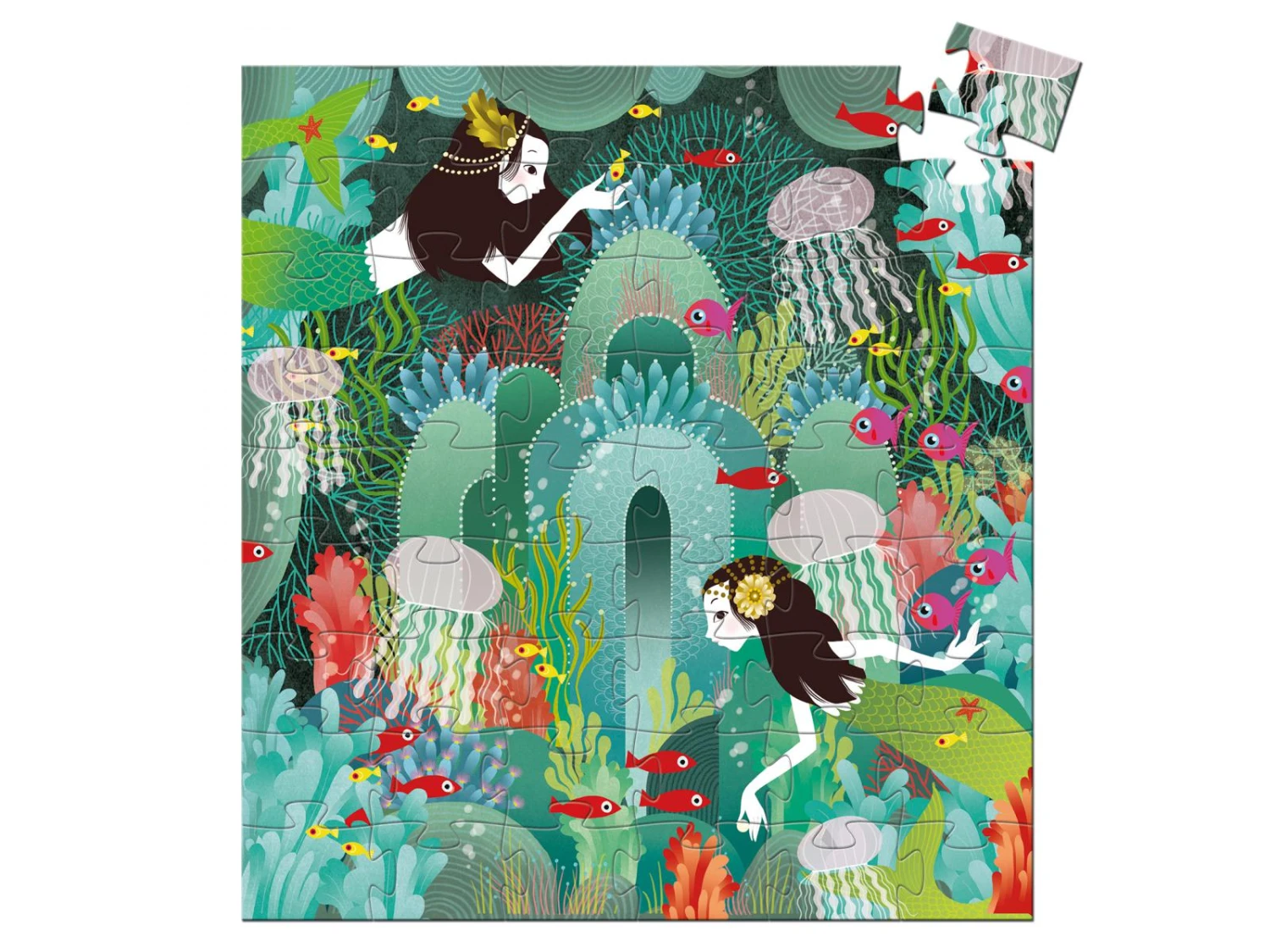 Nageons avec les sirènes et les poissons dans un paradis aquatique. Un magnifique puzzle de 36 pièces dans une boîte élégante en forme de coquillage.