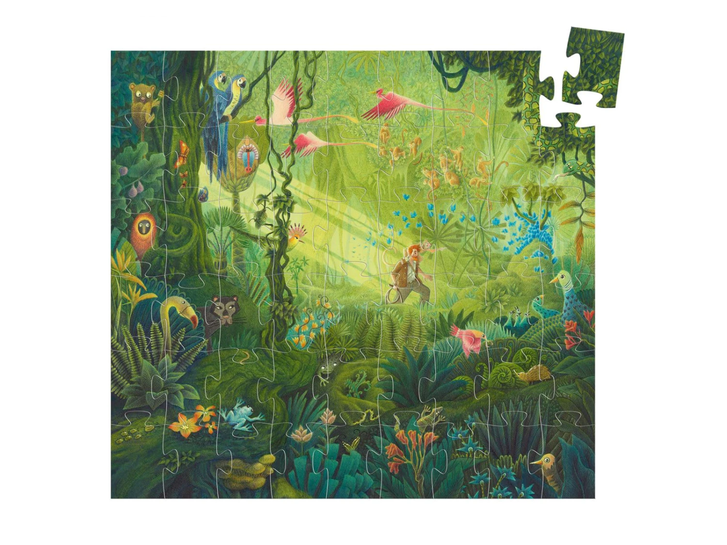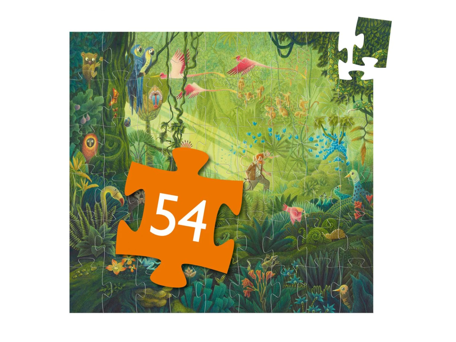 Un aventurier traverse une jungle tropicale remplie d’animaux et de plantes exotiques. Un magnifique puzzle de 54 pièces prĂ©sentĂ© dans une jolie boĂ®te silhouette.