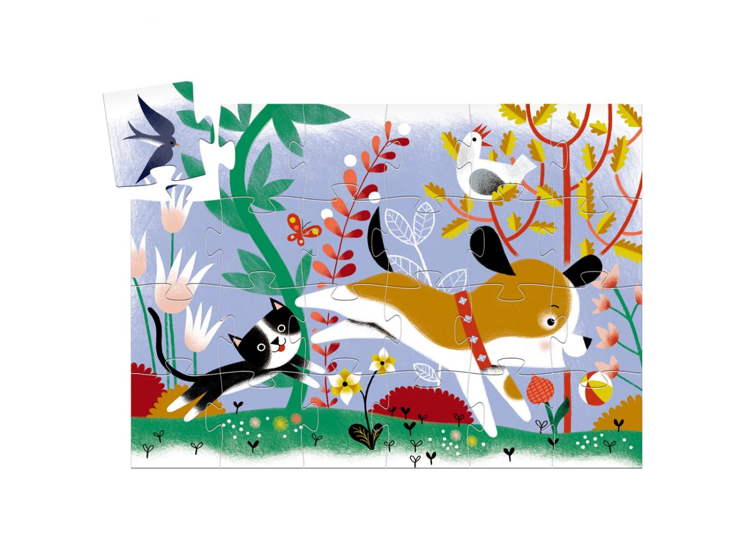 Firmin le petit chien joue dans le jardin avec son copain le chat. Un magnifique puzzle de 24 pièces dans une boîte élégante en forme de chien.