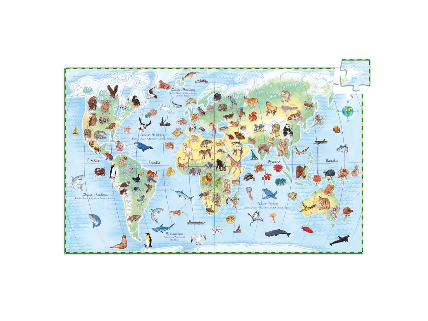 Découvrir les animaux du monde en s’amusant ! Un puzzle de 100 pièces, un poster et un livret pour apprendre le nom des animaux et les régions du monde où ils vivent.