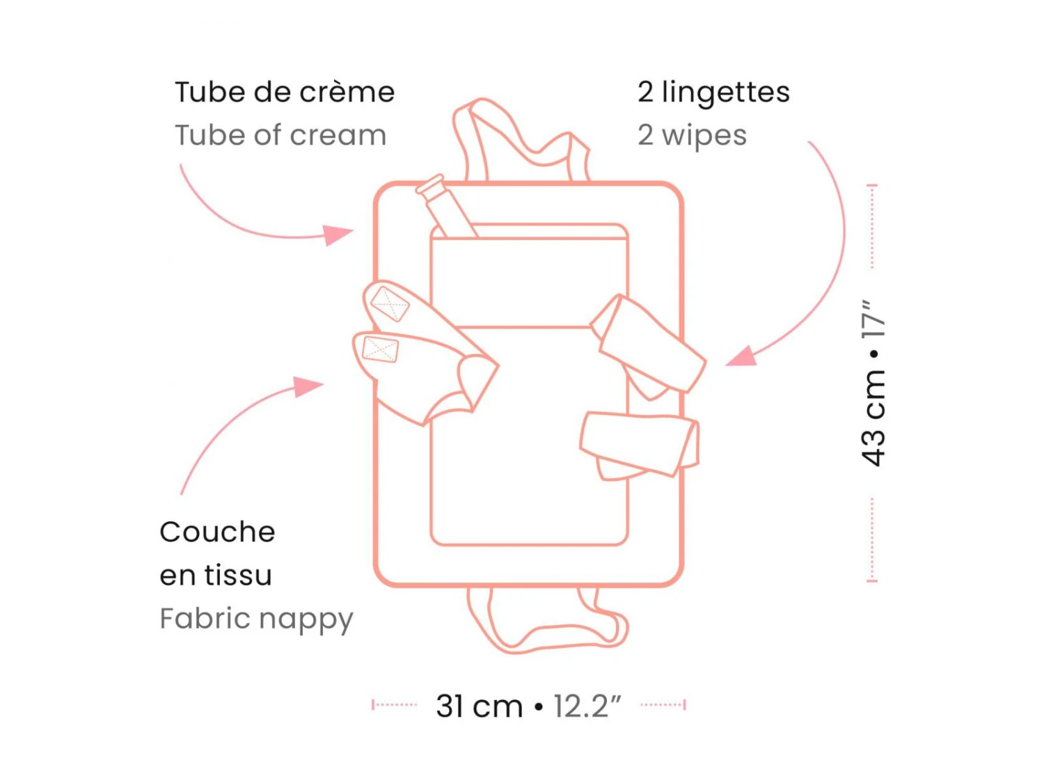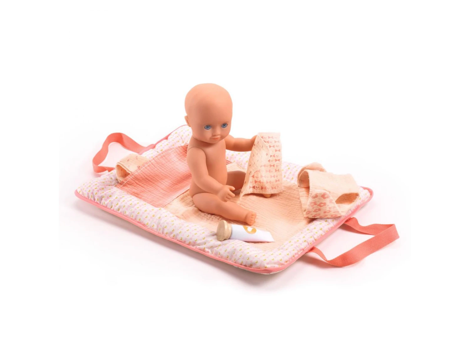 Un sac à langer transportable pour faire la toilette de son poupon. Une fois ouvert, il se trransforme en un matelas confortale pour allonger le bébé. Avec la couche, les lingettes et le tube de crème, bébé aura les fesses toutes propres. Un accessoire indispensable à emporter partout !