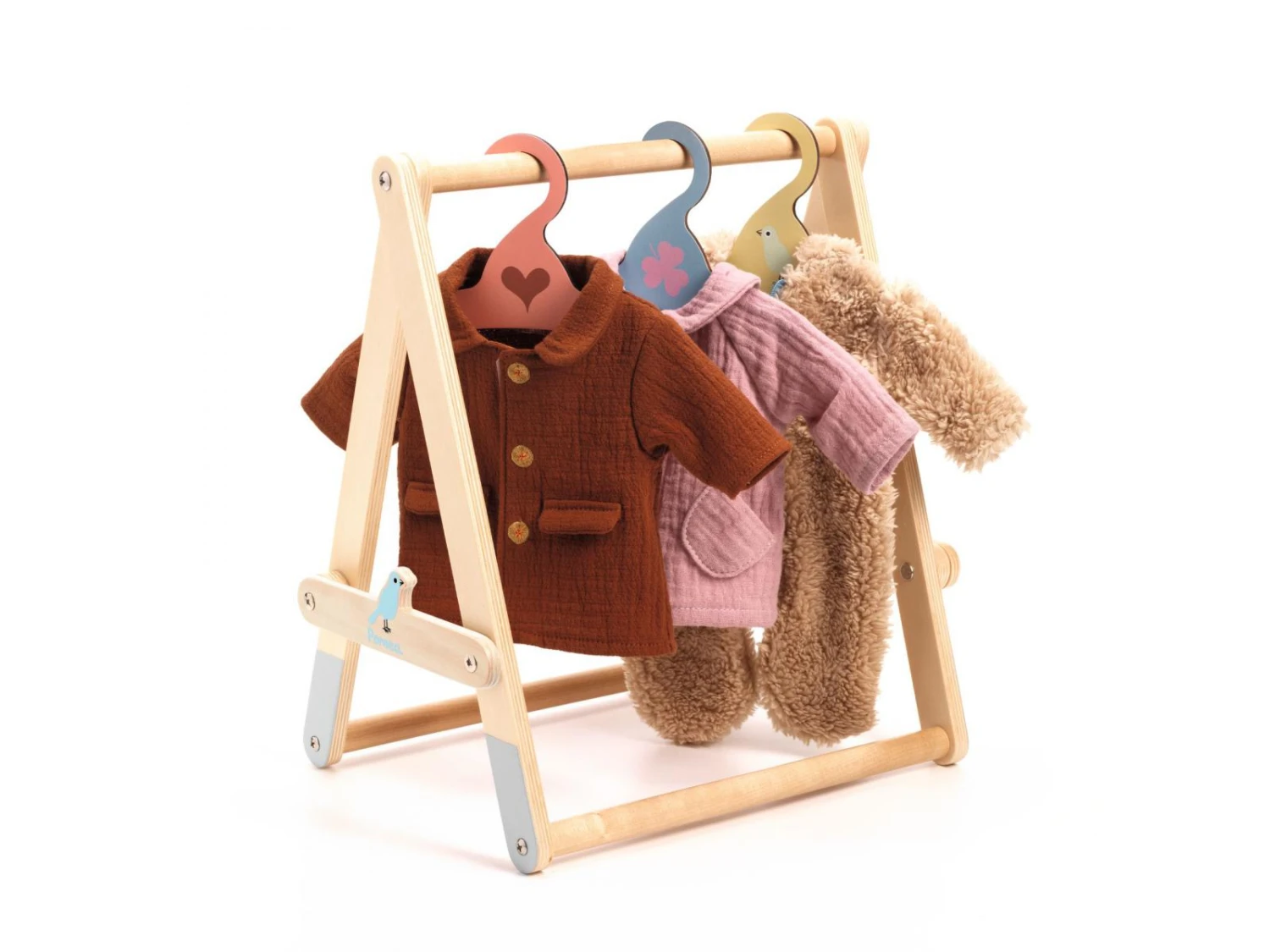 Un porte-vĂȘtements POMEA en bois pour suspendre les habits des poupĂ©es sur les trois cintres.
