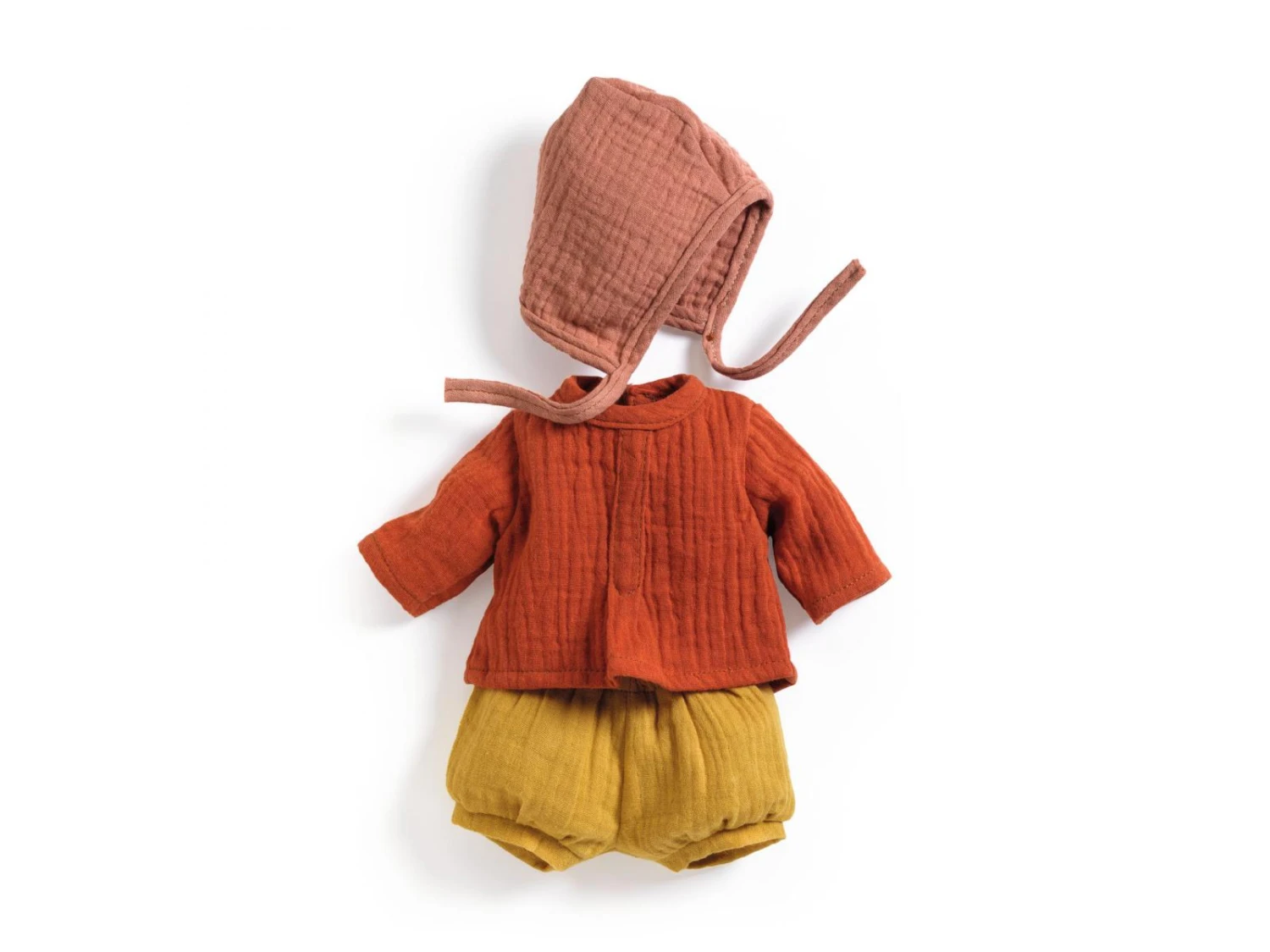 Les poupées sont chics dans cet ensemble de 3 pièces en double Gaze 100 % coton. Un bloomer à taille élastique et une chemise qui se ferme avec des scratchs dans le dos permettent aux petits parents d’habiller facilement la poupée. Le béguin complète joliment cette tenue.