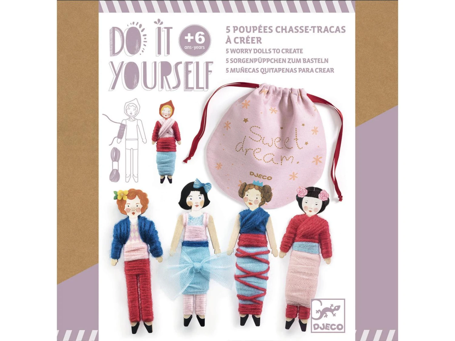 5 poupĂ©es chasse-tracas Ă crĂ©er : les petites poupĂ©es sont Ă vĂŞtir en les enrubannant de laines et de tulles colorĂ©s fournis dans le kit. Une fois habillĂ©es, les enfants n’ont plus qu’Ă leur confier leurs soucis et Ă les glisser sous leur oreiller dans le joli pochon fourni. InspirĂ©es d’une tradition du Guatemala, ces petites poupĂ©es s’occupent de chasser les petits tracas et permettent aux enfants de passer une douce nuit.