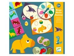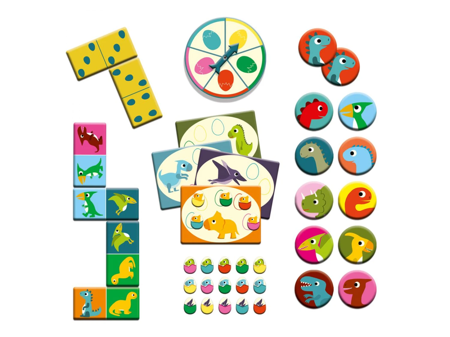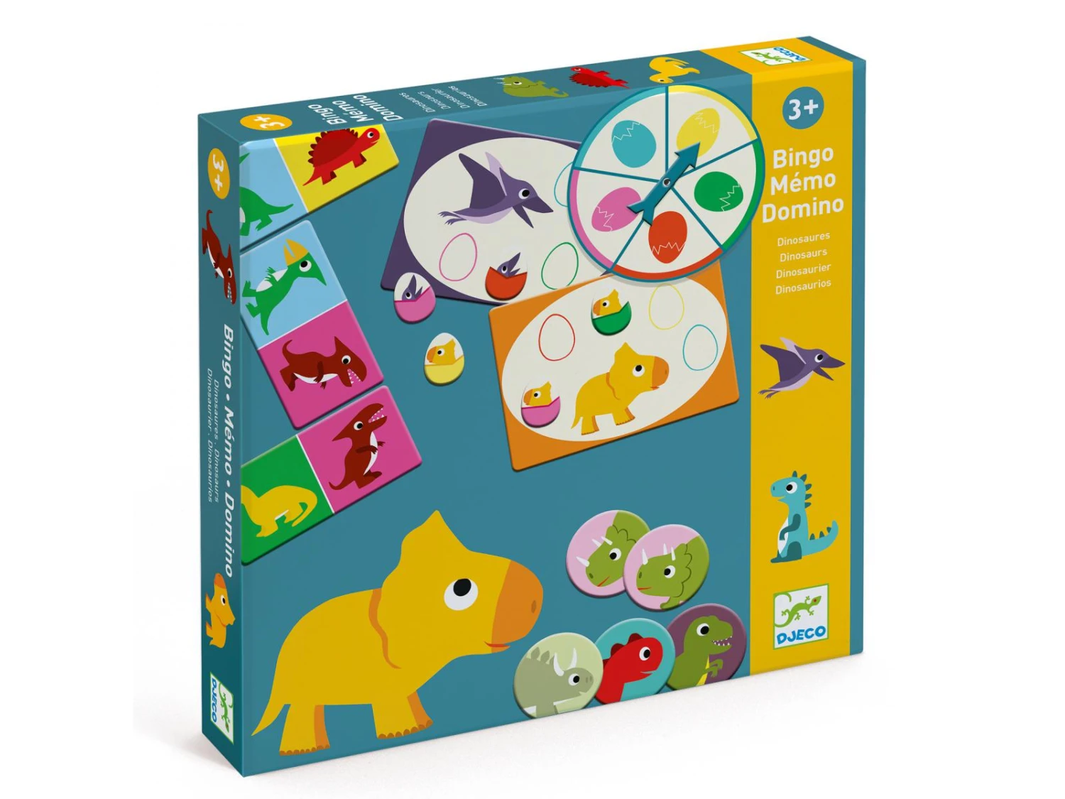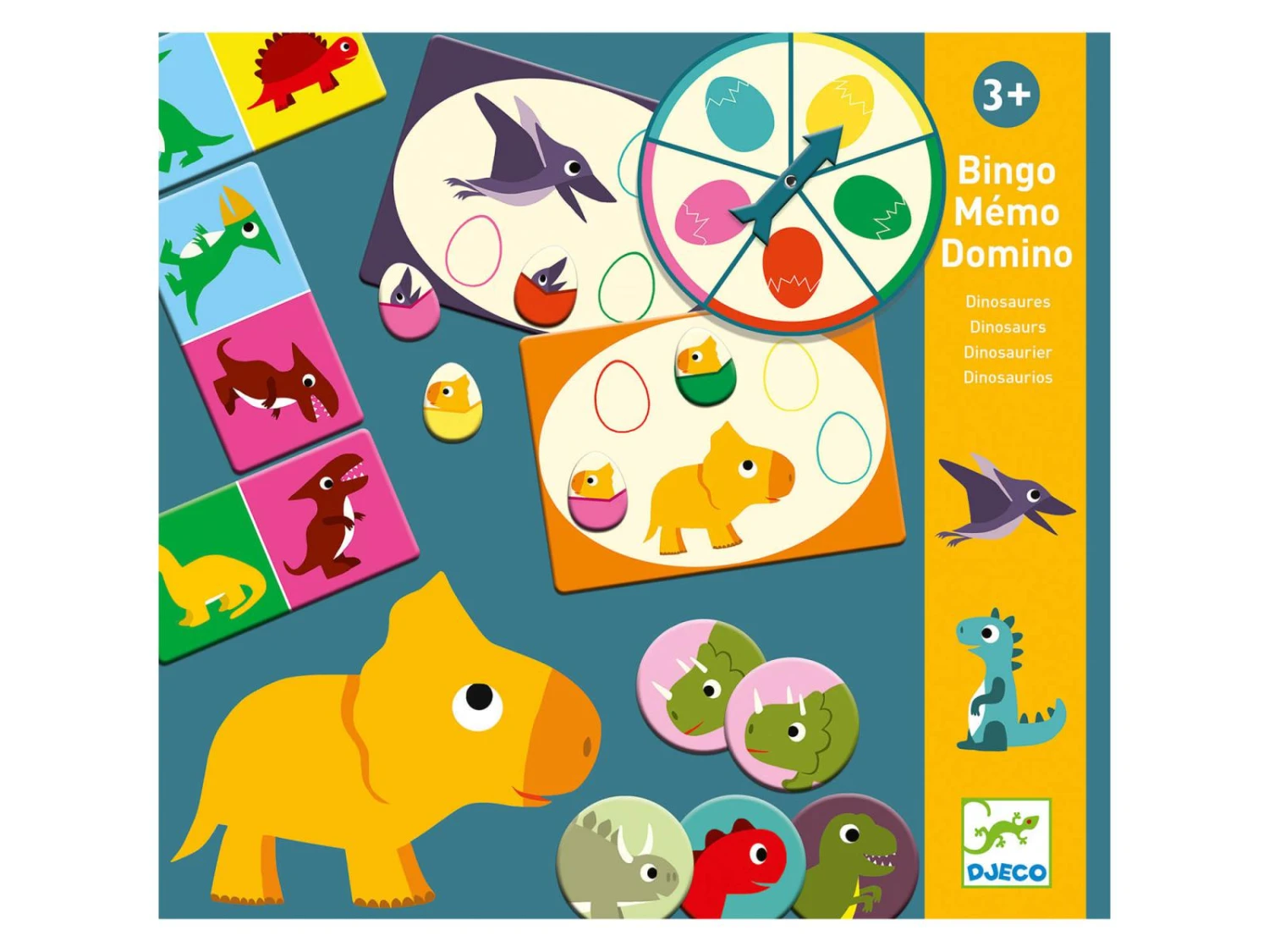 Un coffret complet contenant 3 jeux éducatifs : un mémo, un bingo et un domino avec des illustrations sur le thème des dinosaures.