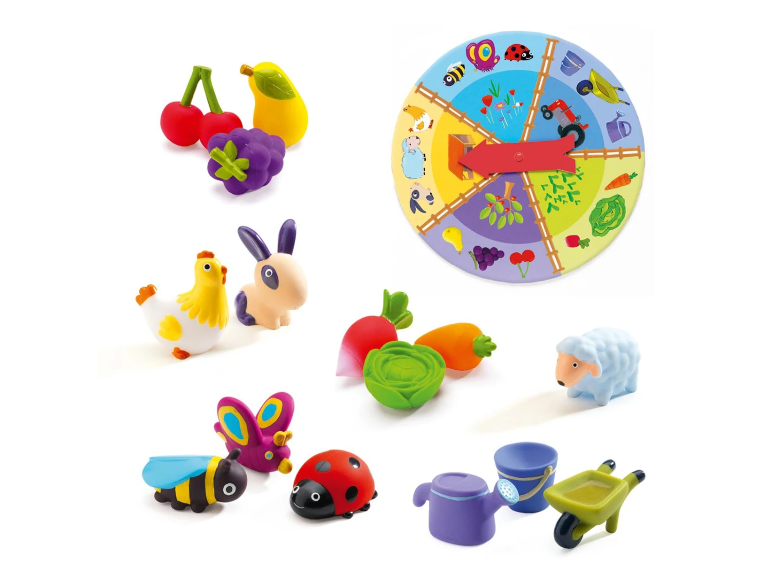 Tactilo Loto Ferme est un jeu éducatif et tactile. L’enfant tourne la roue et retrouve tactilement un fruit, un insecte, un animal, un légume ou un accessoire selon l’instruction indiquée par la flèche.