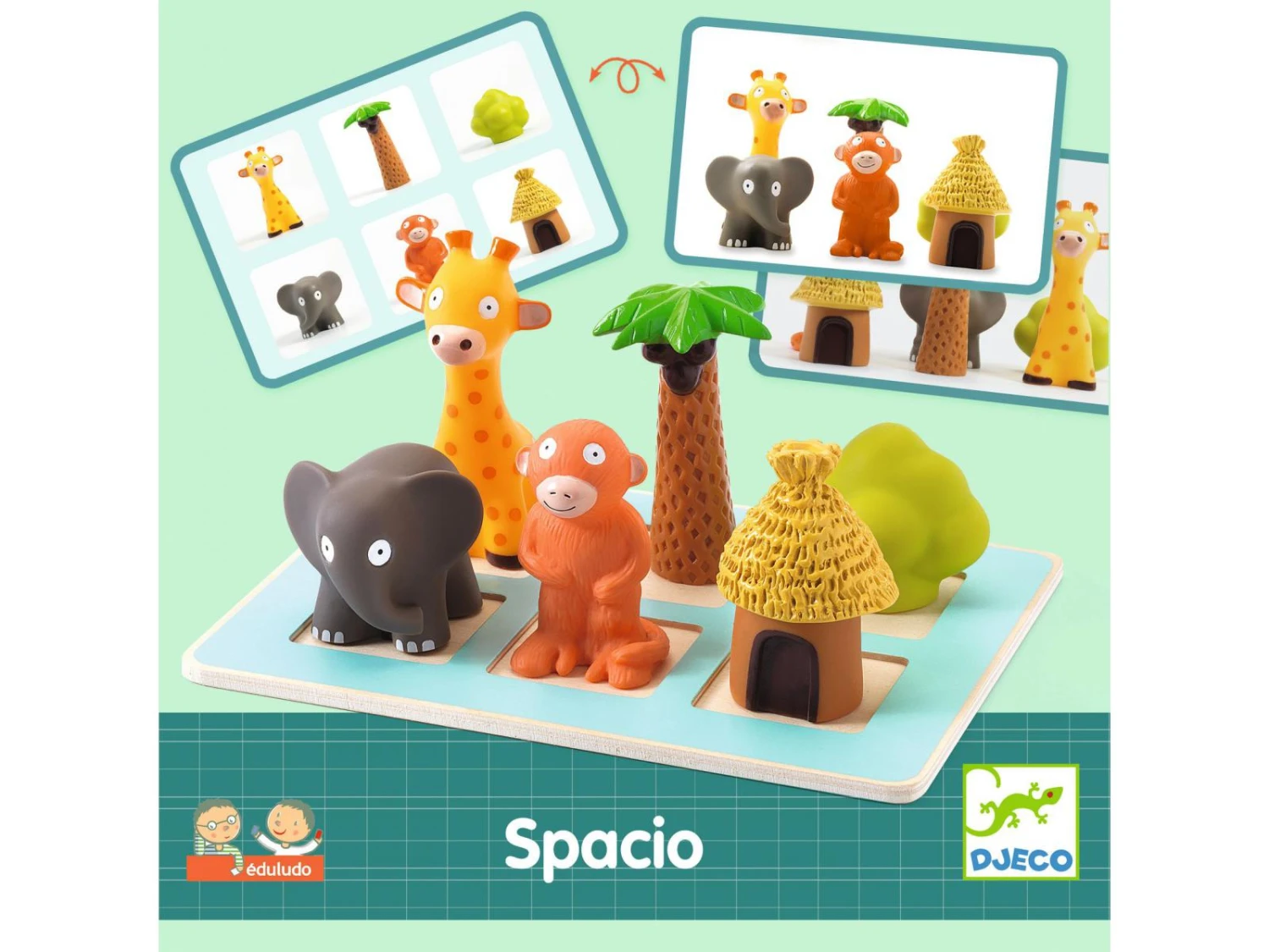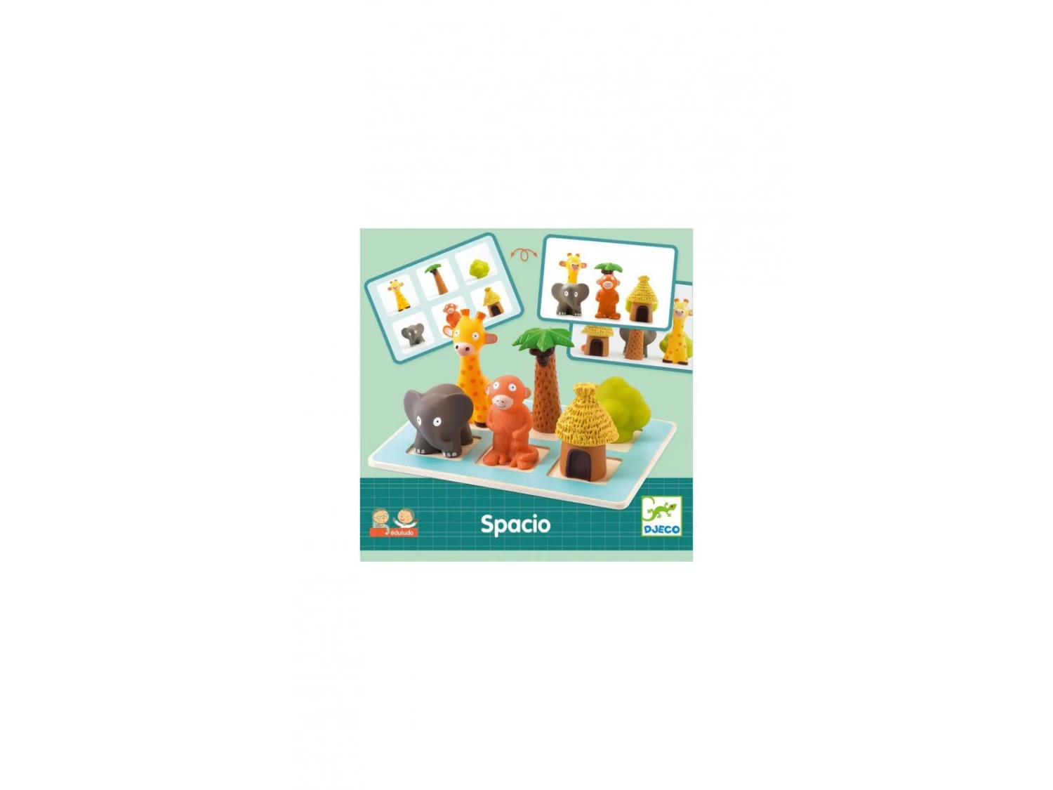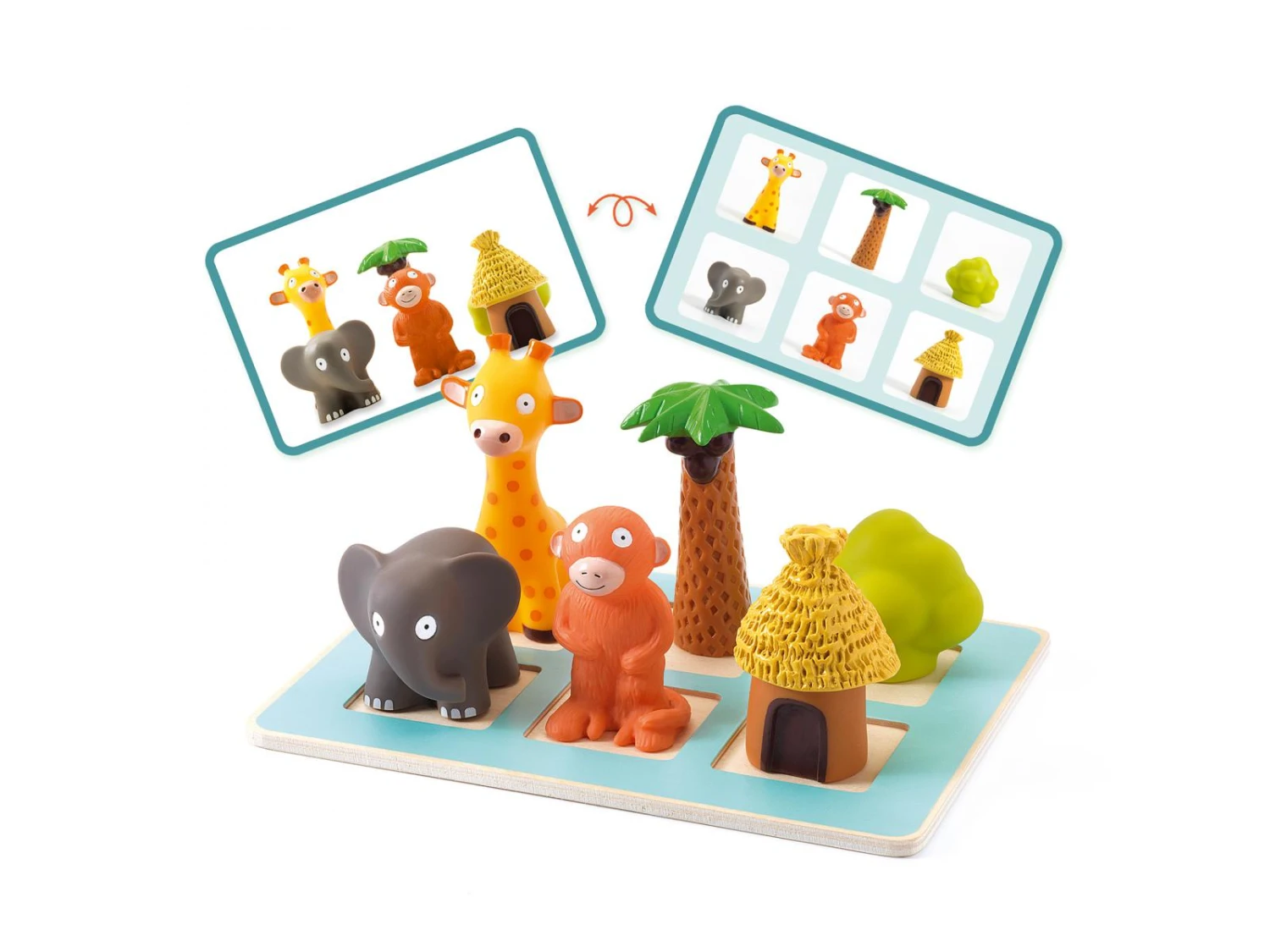 Un jeu simple et amusant de la collection Eduludo pour apprendre à se repérer dans l’espace. Pour reproduire la photo, l’enfant doit placer correctement les figurines sur le plateau. Où est la girafe, devant ou derrière l’éléphant ? À droite ou à gauche ? Les solutions sont indiquées au dos des cartes.