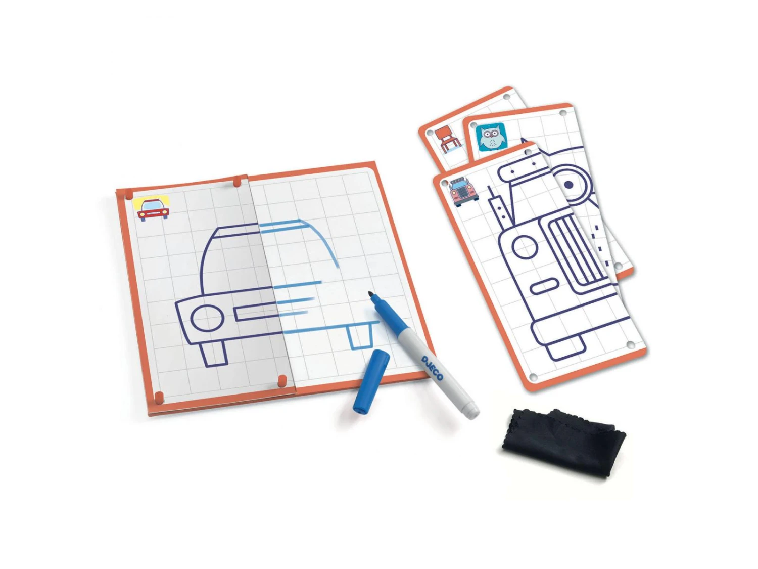 Apprendre Ă dessiner en utilisant la symĂ©trie. Des cartes « modèle » Ă placer sur un plateau quadrillĂ© pour guider l’enfant. Il recommence autant de fois qu’il le souhaite avec le feutre effaçable. Une première approche ludique et facile de la symĂ©trie axiale.