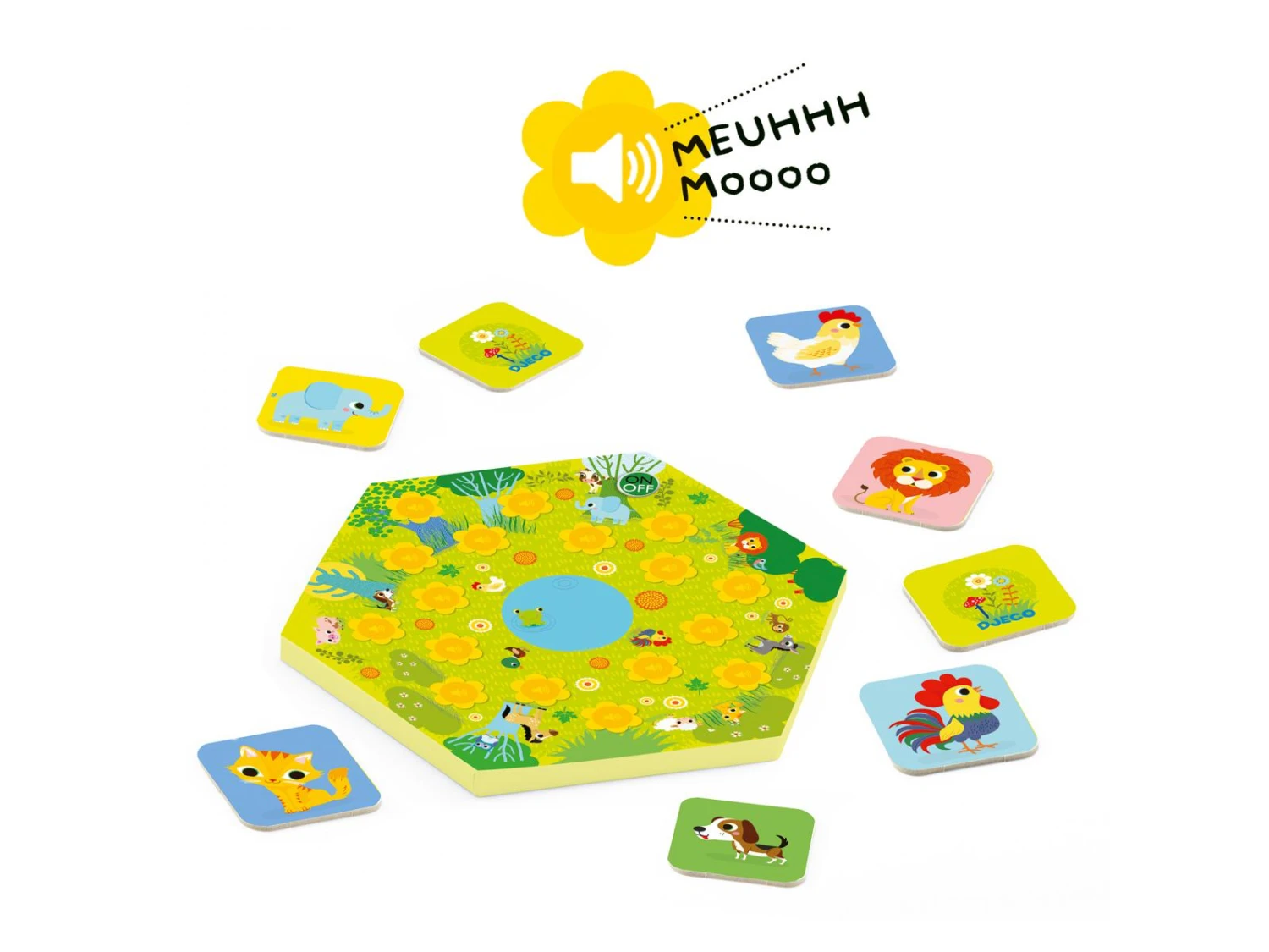 Un jeu de mĂ©moire sonore rigolo oĂą il faut appuyer sur le cri de l’animal qui se trouve la carte. Un classique revisitĂ© pour faire preuve de mĂ©moire et de capacitĂ© d’écoute.
