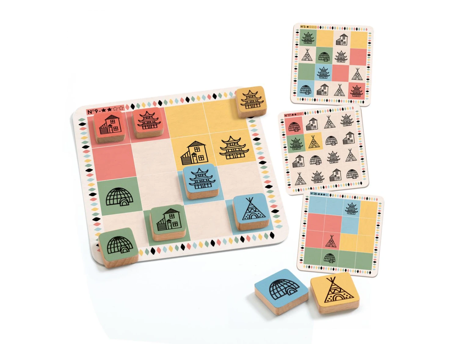 Un jeu de logique. Sur le principe du Sudoku, il faut placer les 16 jetons en bois sur les grilles selon les contraintes indiquées. Réflexion et logique seront nécessaires pour venir à bout des 40 défis.