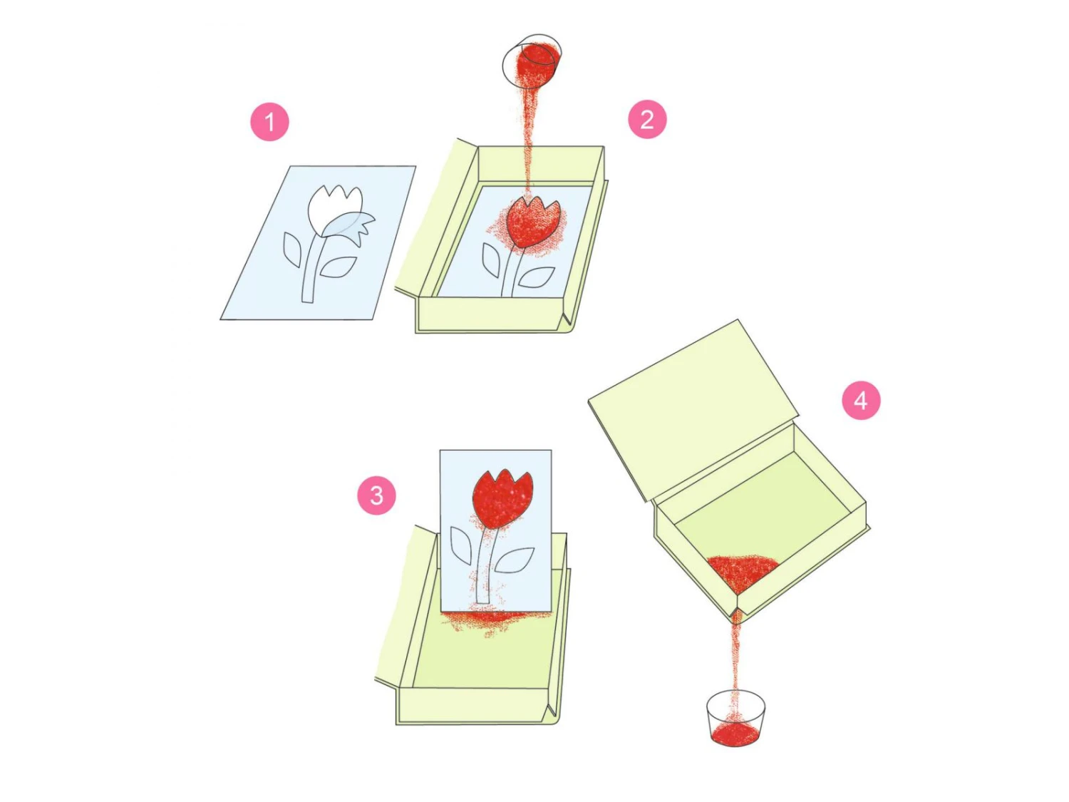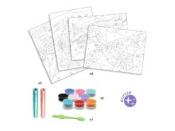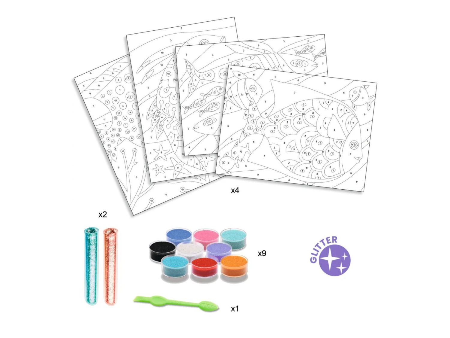 4 tableaux sur le thème des poissons à illuminer avec du sable coloré et des paillettes. L’enfant place son tableau dans la boîte, il dévoile les zones préencollées grâce à l’outil fourni, puis les saupoudre de sables colorés et de poudre pailletée en suivant le code couleur indiqué dans le livret. Une fois l’activité terminée, les couleurs des images sont révélées et les poissons brillent de mille feux !