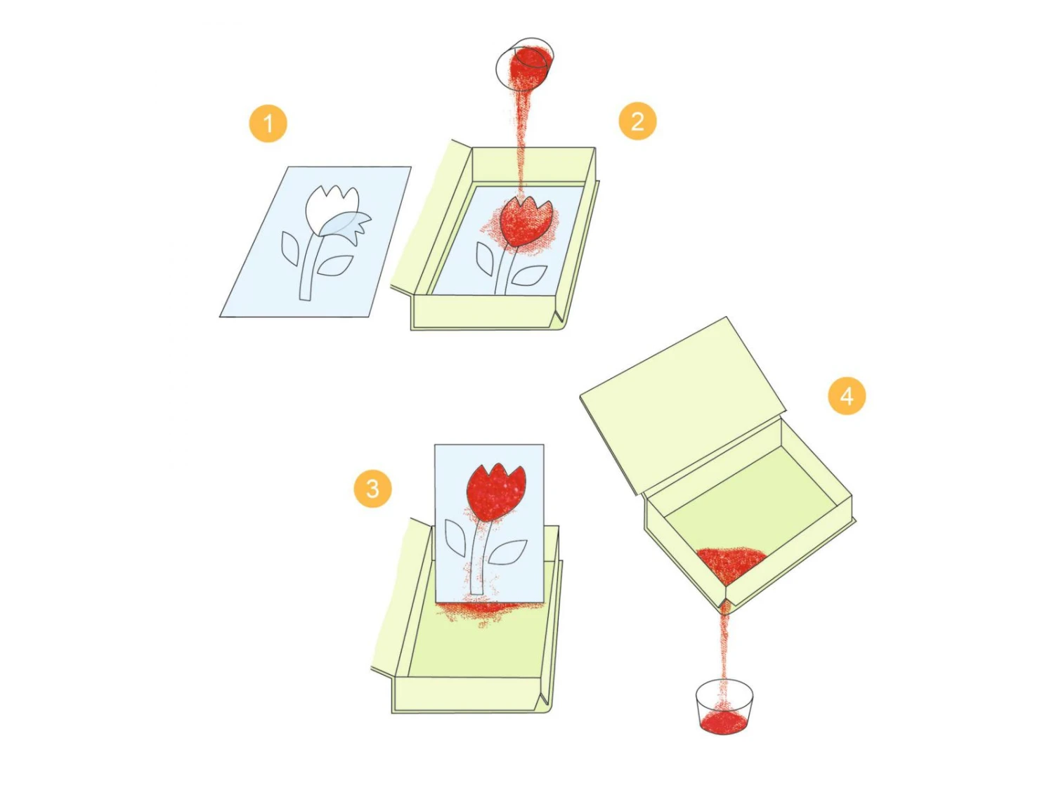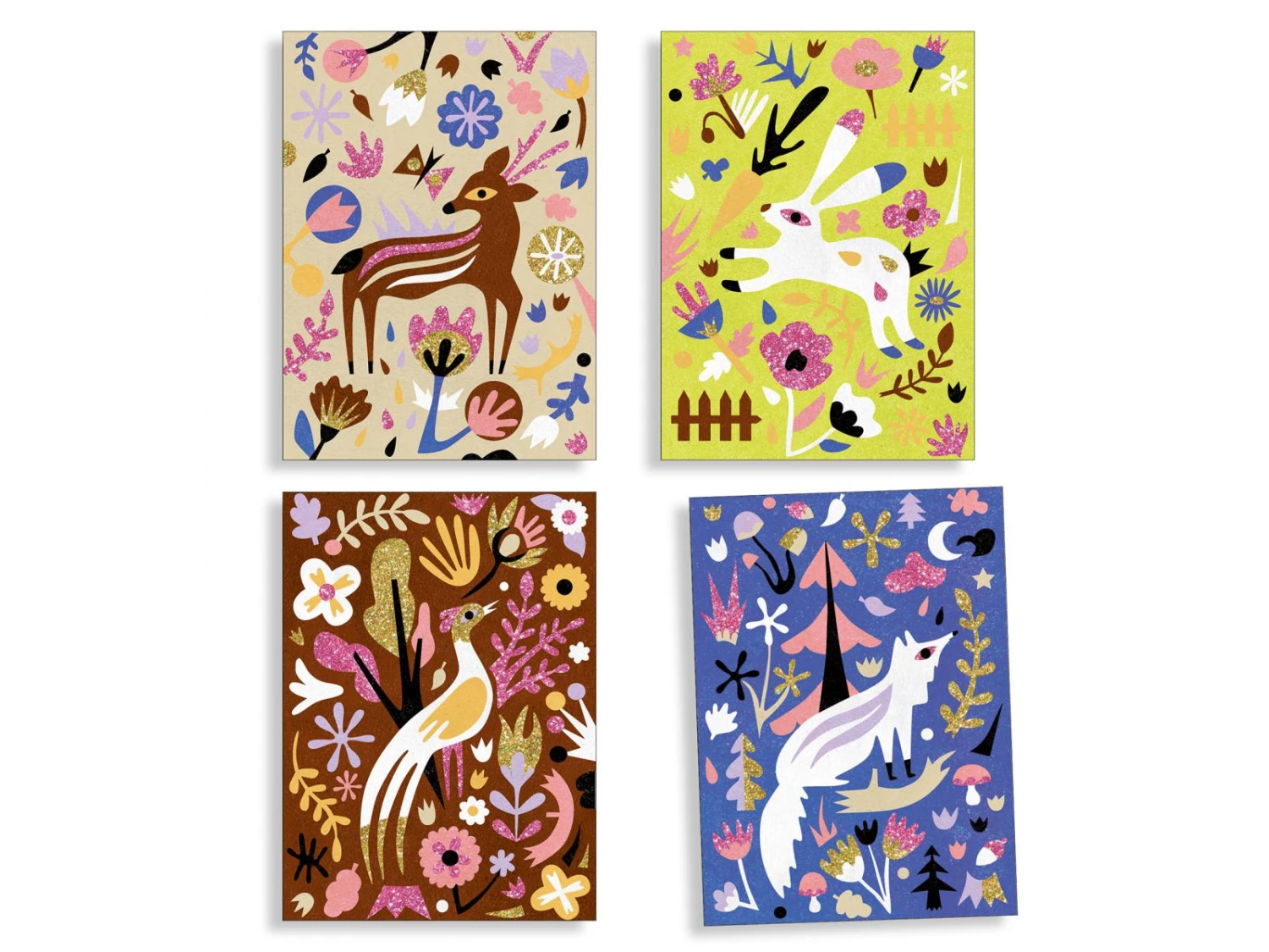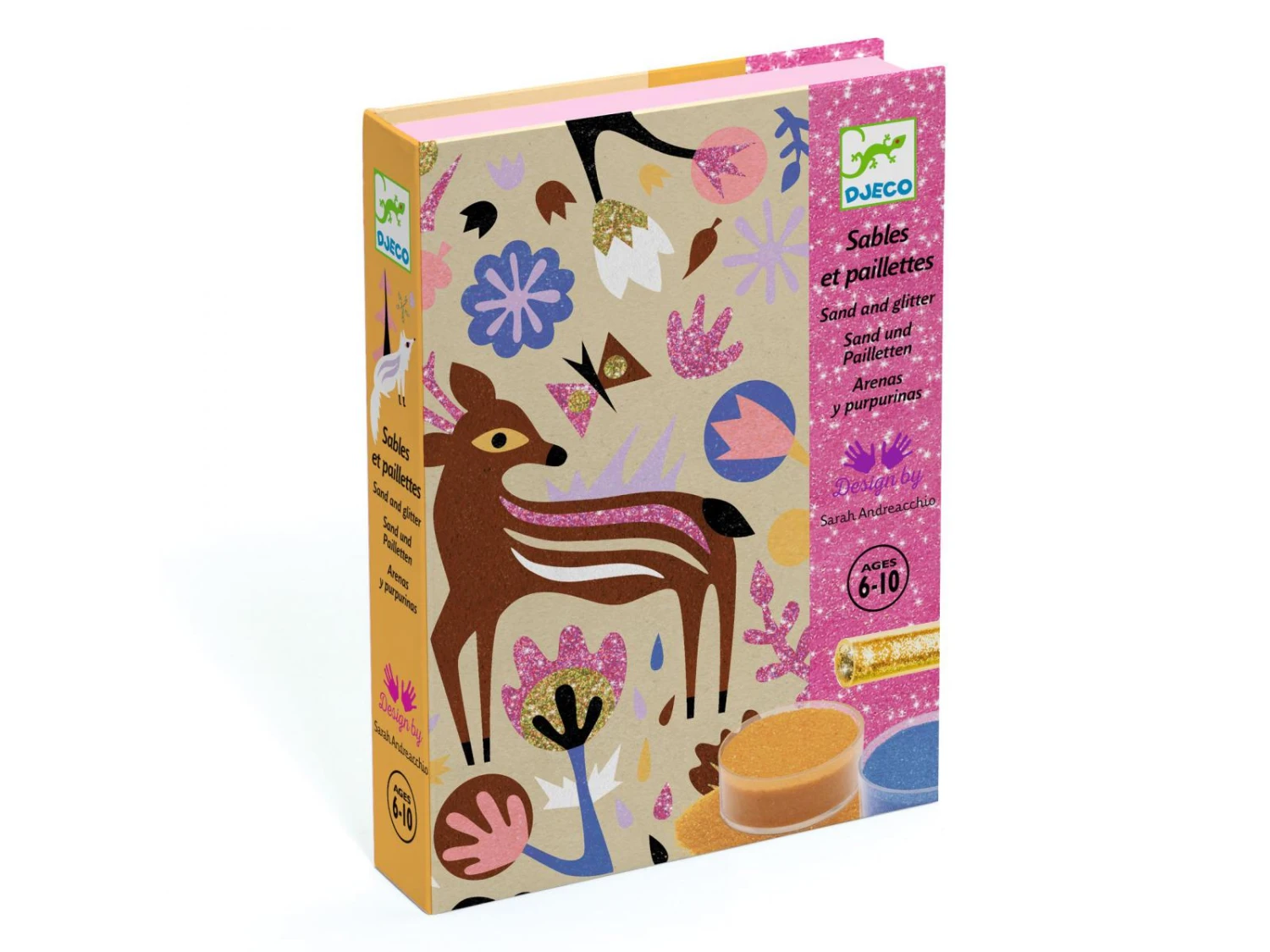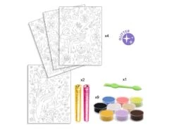 4 tableaux sur le thème de la forêt à illuminer avec du sable coloré et des paillettes. L’enfant place son tableau dans la boîte, il dévoile les zones préencollées grâce à l’outil fourni, puis les saupoudre de sables colorés et de poudre pailletée en suivant le code couleur indiqué dans le livret. Une fois l’activité terminée, les couleurs des tableaux sont révélées et les sous-bois prennent vie !