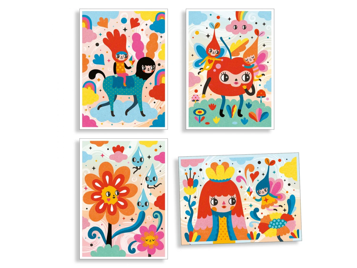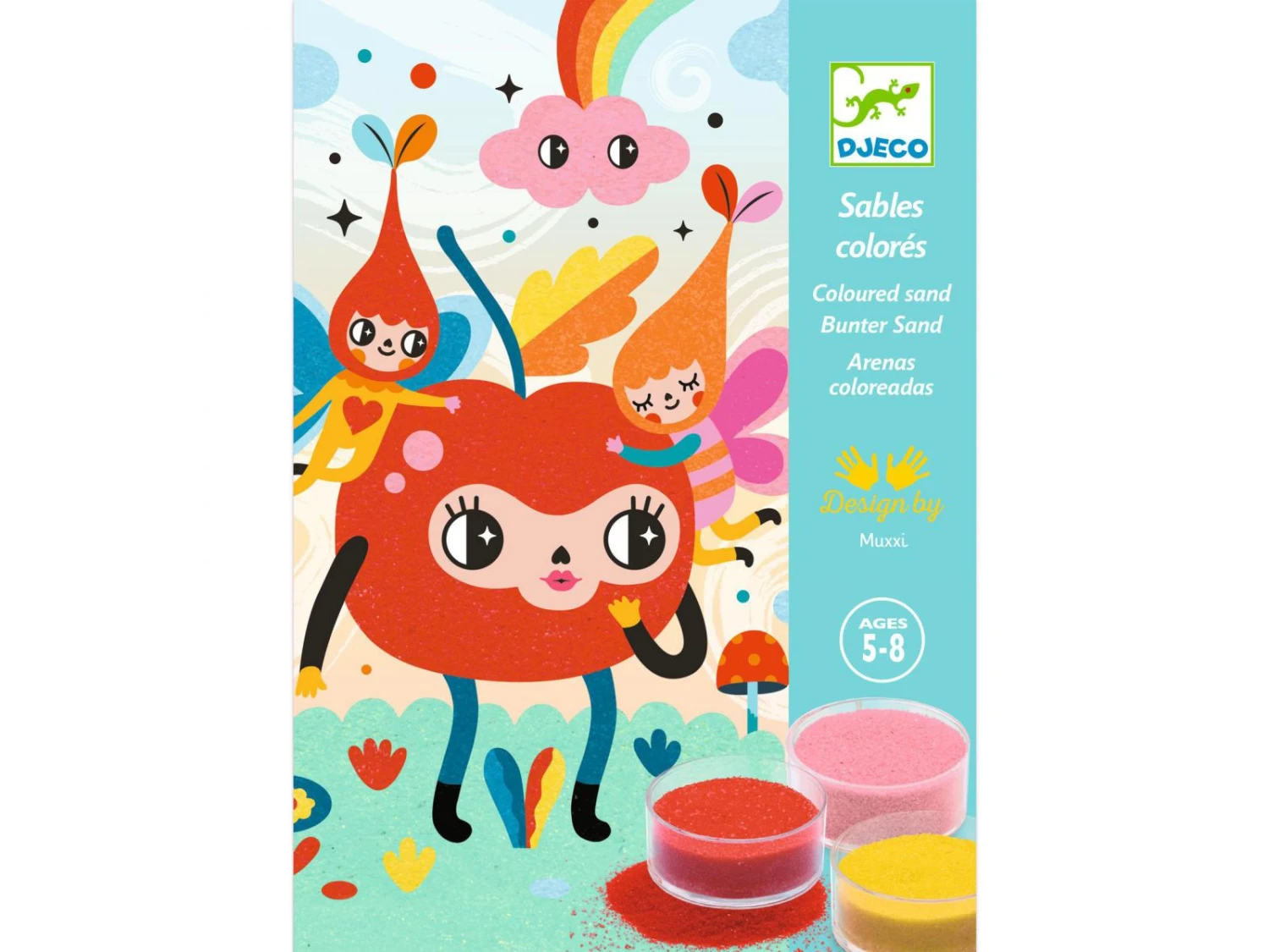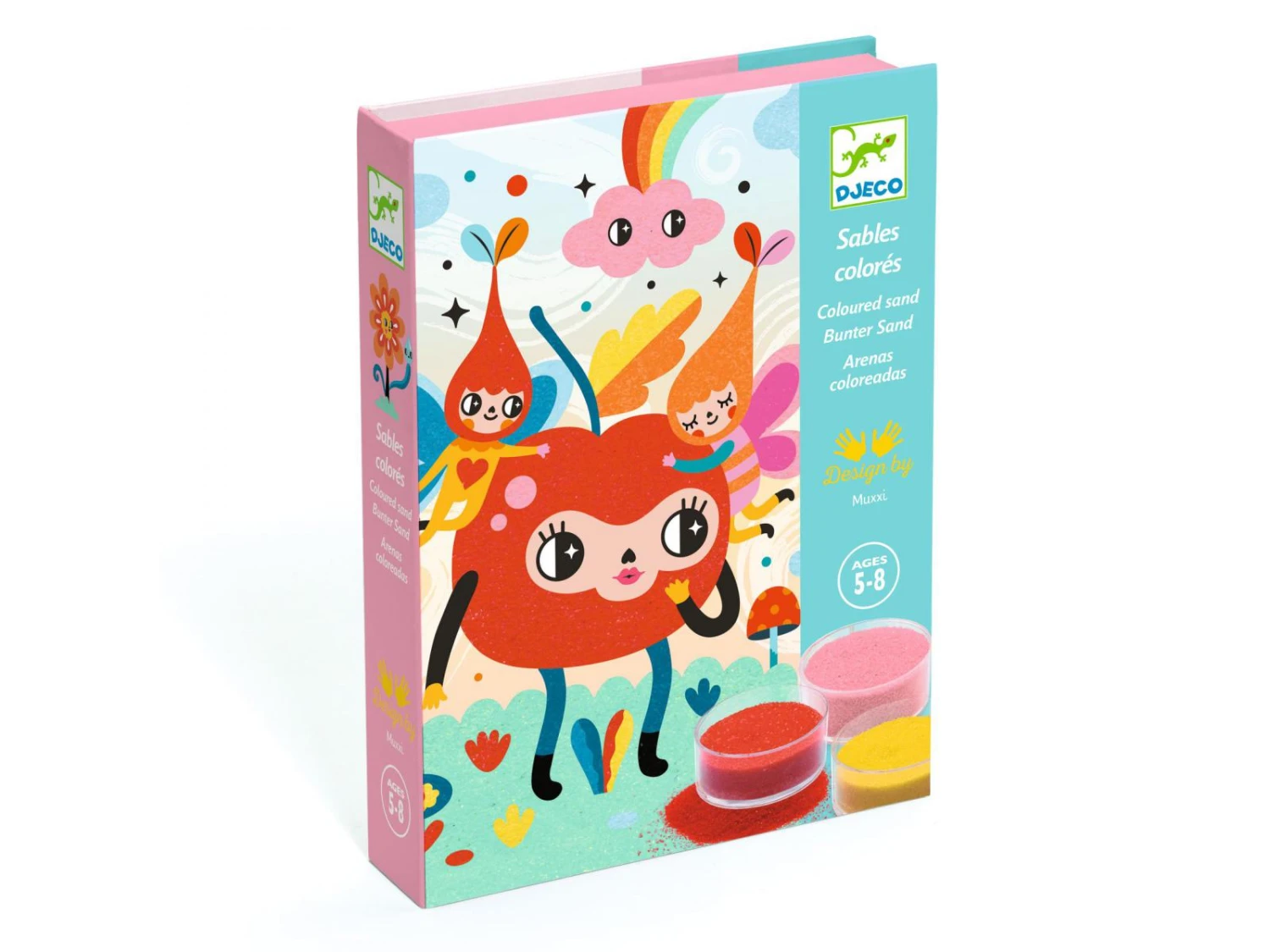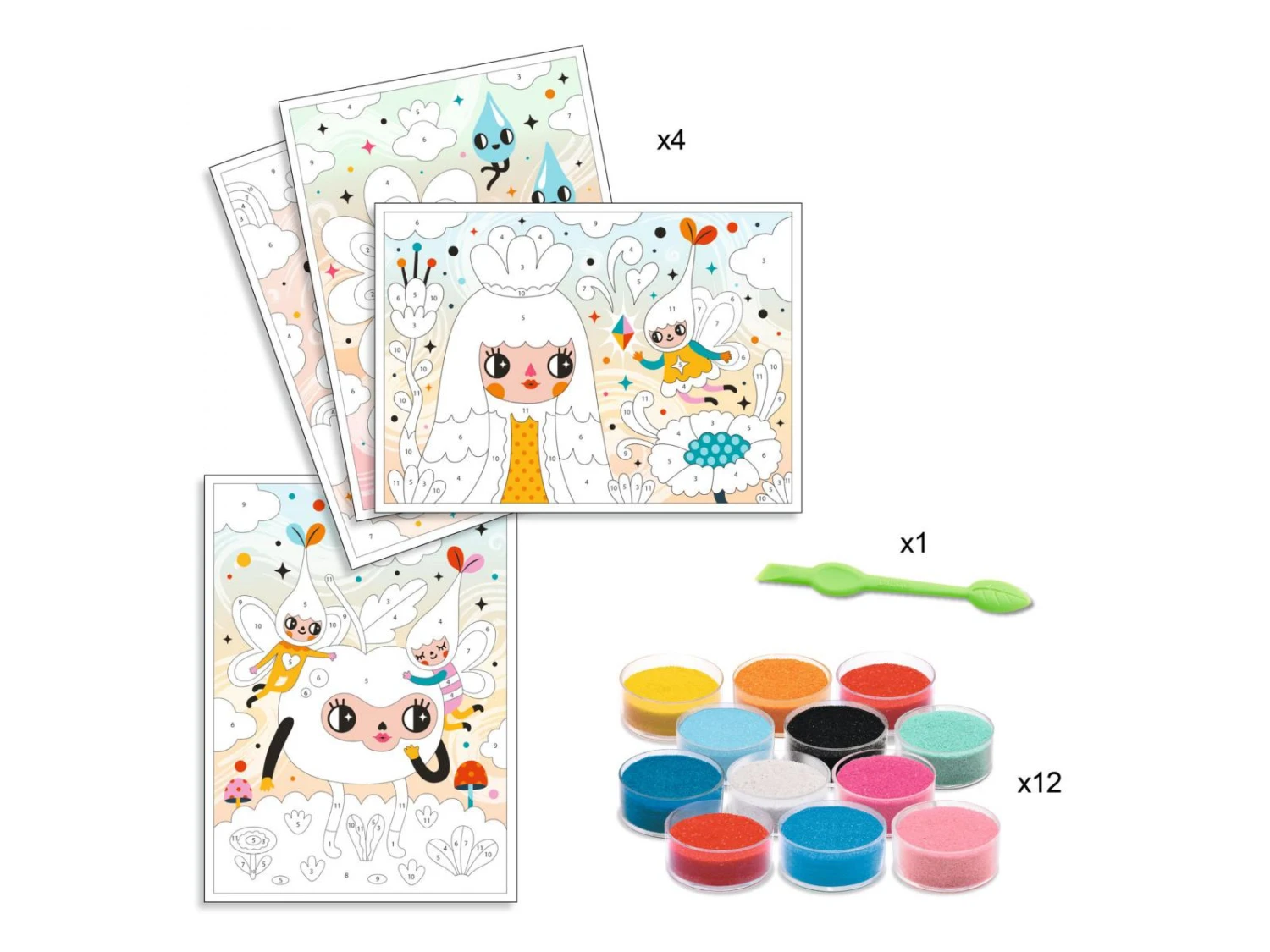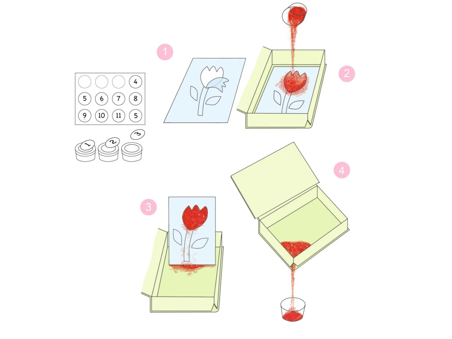 Une première activité de sables colorés adaptée aux plus jeunes. Pour compléter ces 4 tableaux, l’enfant place sa planche dans la boîte, dévoile les grandes zones préencollées grâce à l’outil fourni, puis les saupoudre de sables colorés en suivant le code couleur indiqué dans le livret. Entre chaque étape, l’enfant récupère le surplus de sable grâce au petit trou percé dans le coin de la boîte. Pratique pour éviter de mélanger les couleurs !