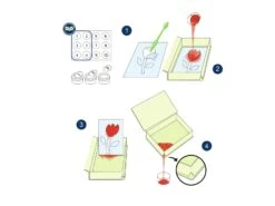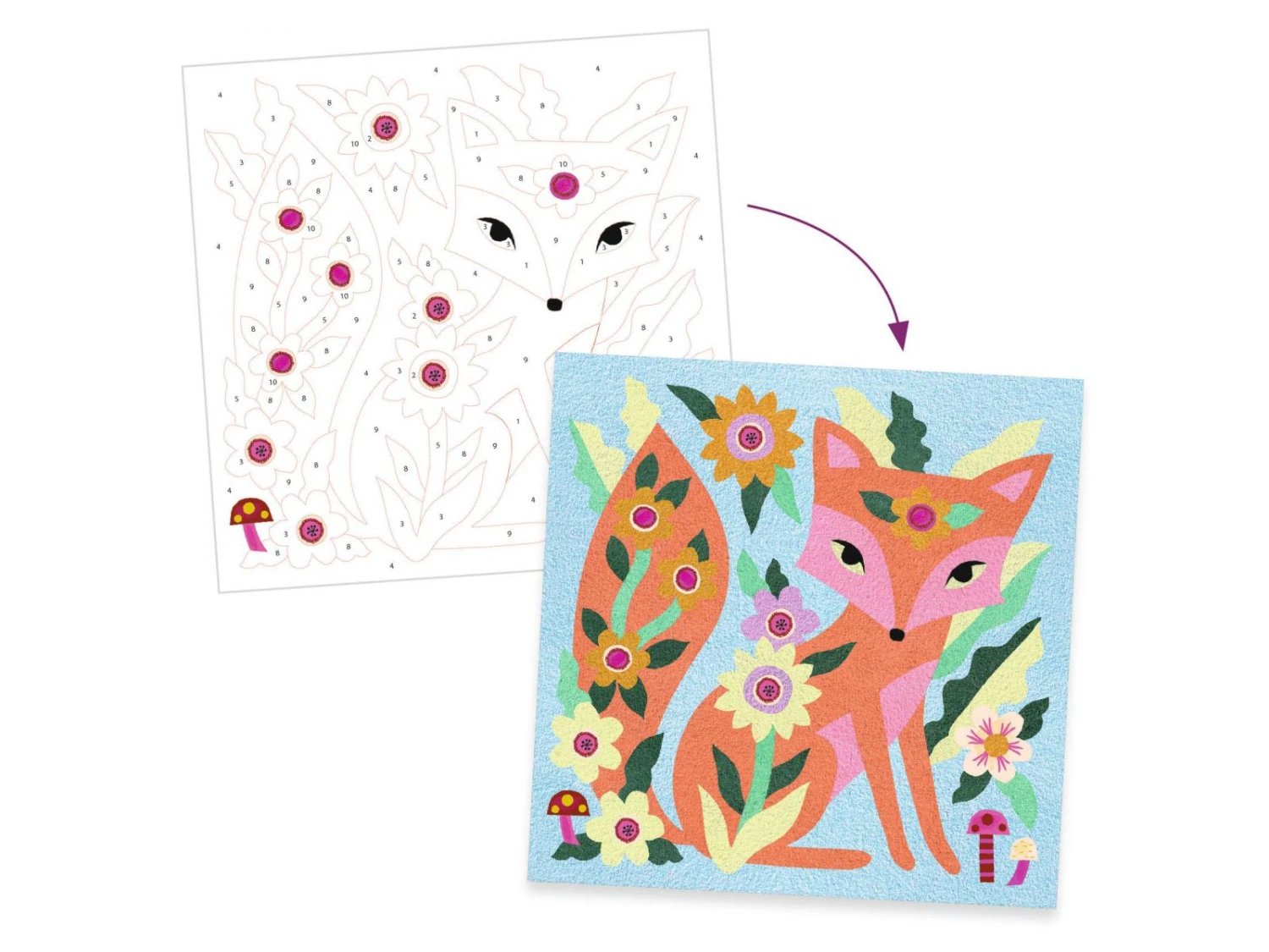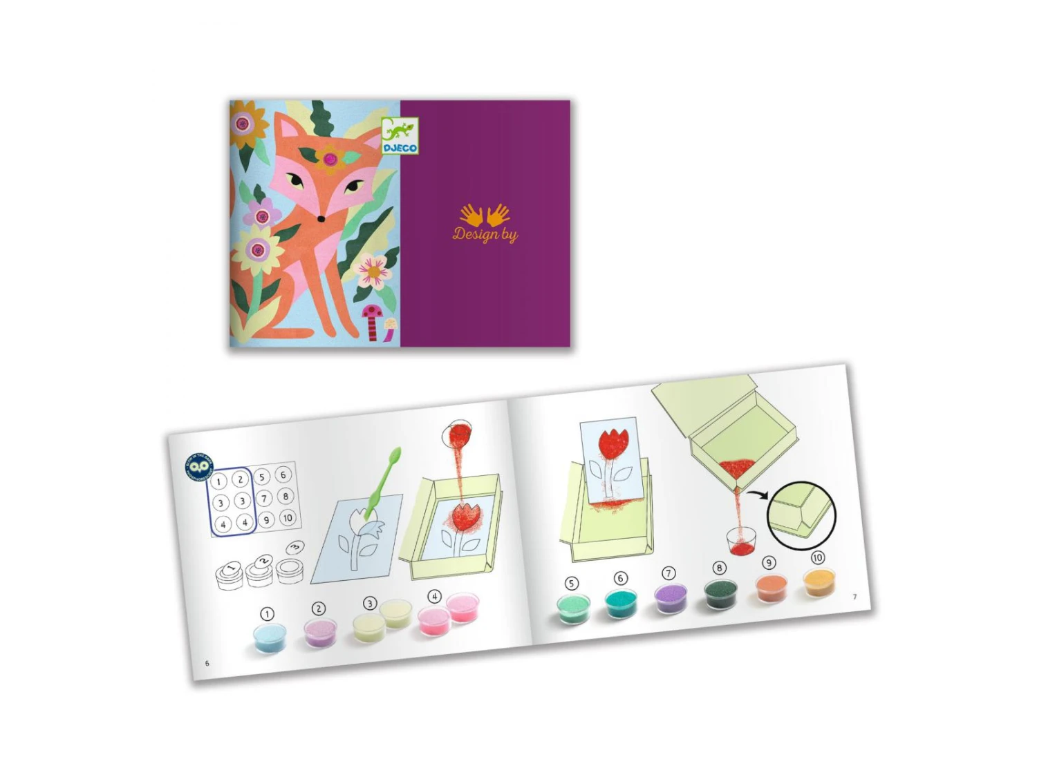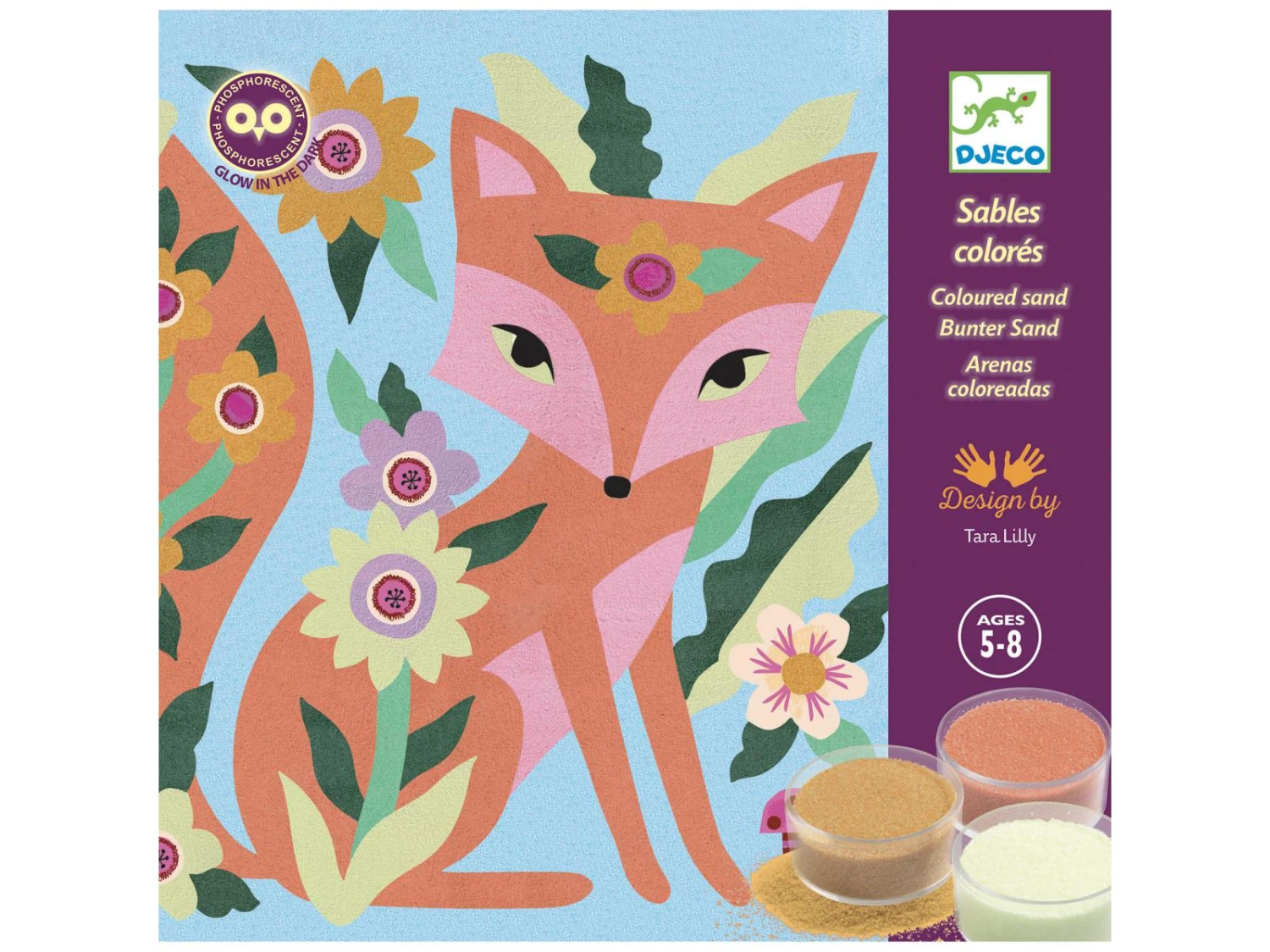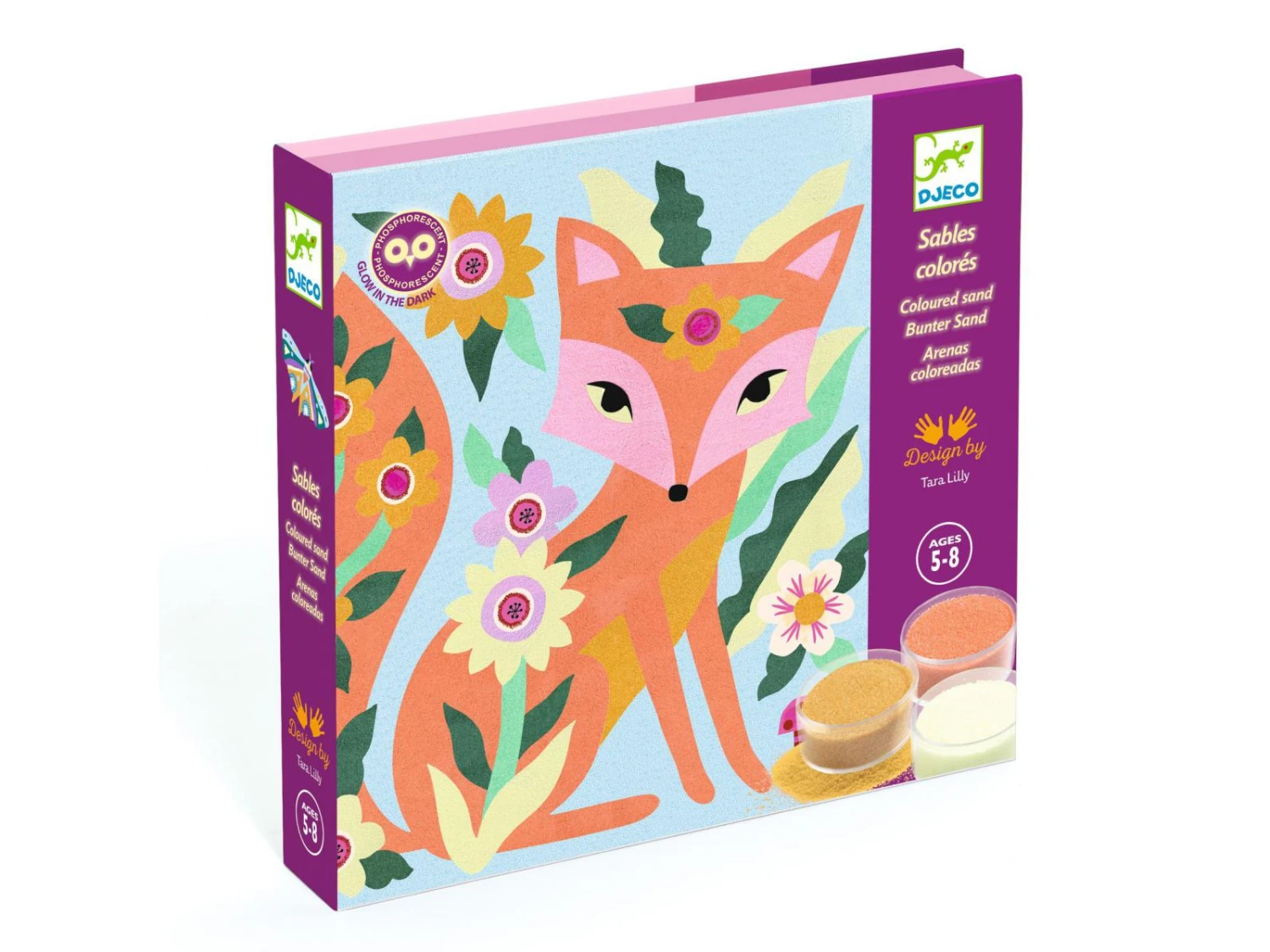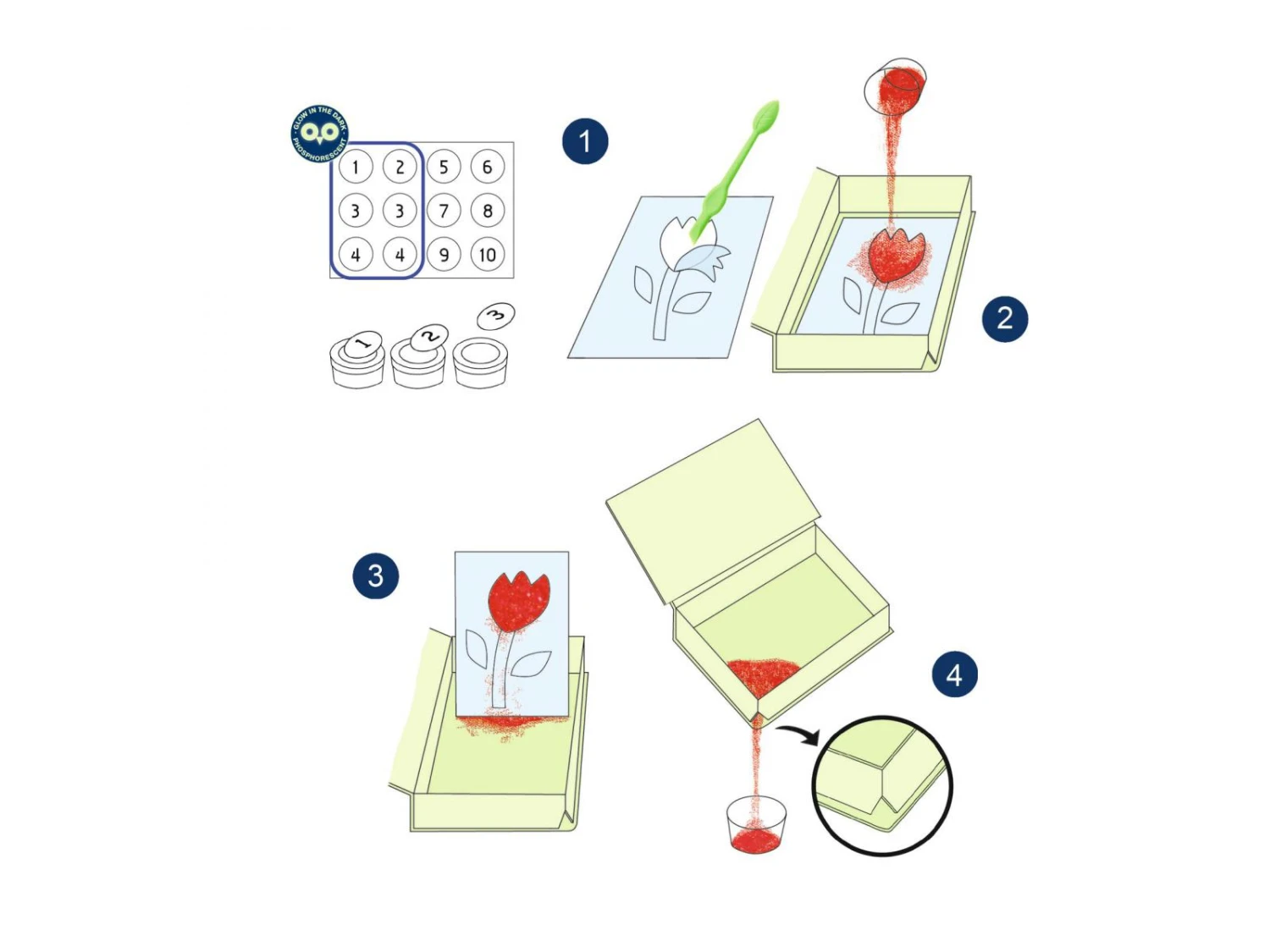 4 tableaux prĂ©sentant des animaux nocturnes Ă mettre en couleurs avec des sables colorĂ©s et phosphorescents. L’enfant place son tableau dans la boĂ®te, il dĂ©voile les zones prĂ©encollĂ©es grâce Ă l’outil fourni puis les saupoudre de sable en suivant le code couleurs indiquĂ© dans le livret. Une fois les tableaux exposĂ©s, quelle surprise Ă la nuit tombĂ©e : les illustrations se rĂ©vèlent dans le noir !