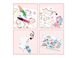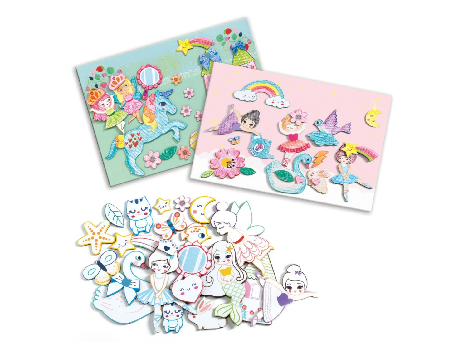 Un coffret créatif sur le thème des filles. Une multitude de formes en carton épais à colorier et à coller sur les 6 grands décors. Le livret pas à pas propose à l’enfant quelques modèles.