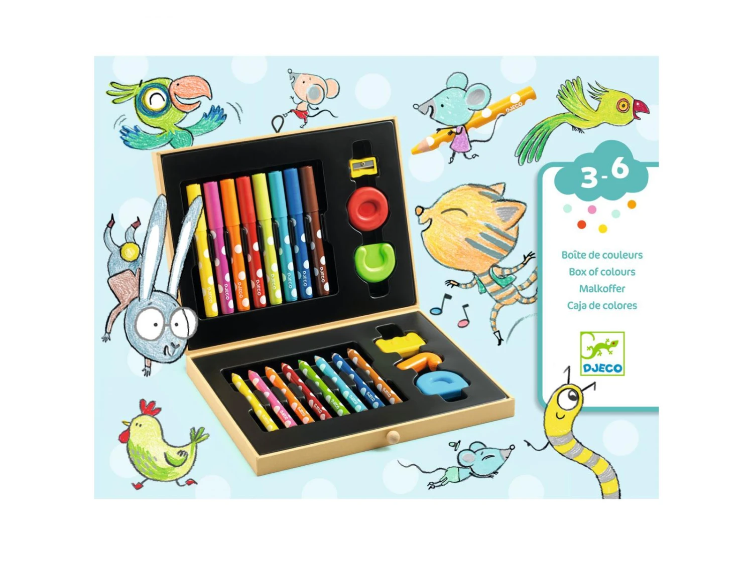 Une première mallette de couleurs qui contient tout le matĂ©riel nĂ©cessaire aux petits artistes : 8 crayons de couleurs ergonomiques, 8 feutres Ă grosse pointe lavables et 5 crayons de cire sculptĂ©s et un taille crayon. L’extĂ©rieur de la mallette peut se colorier pour la rendre unique !