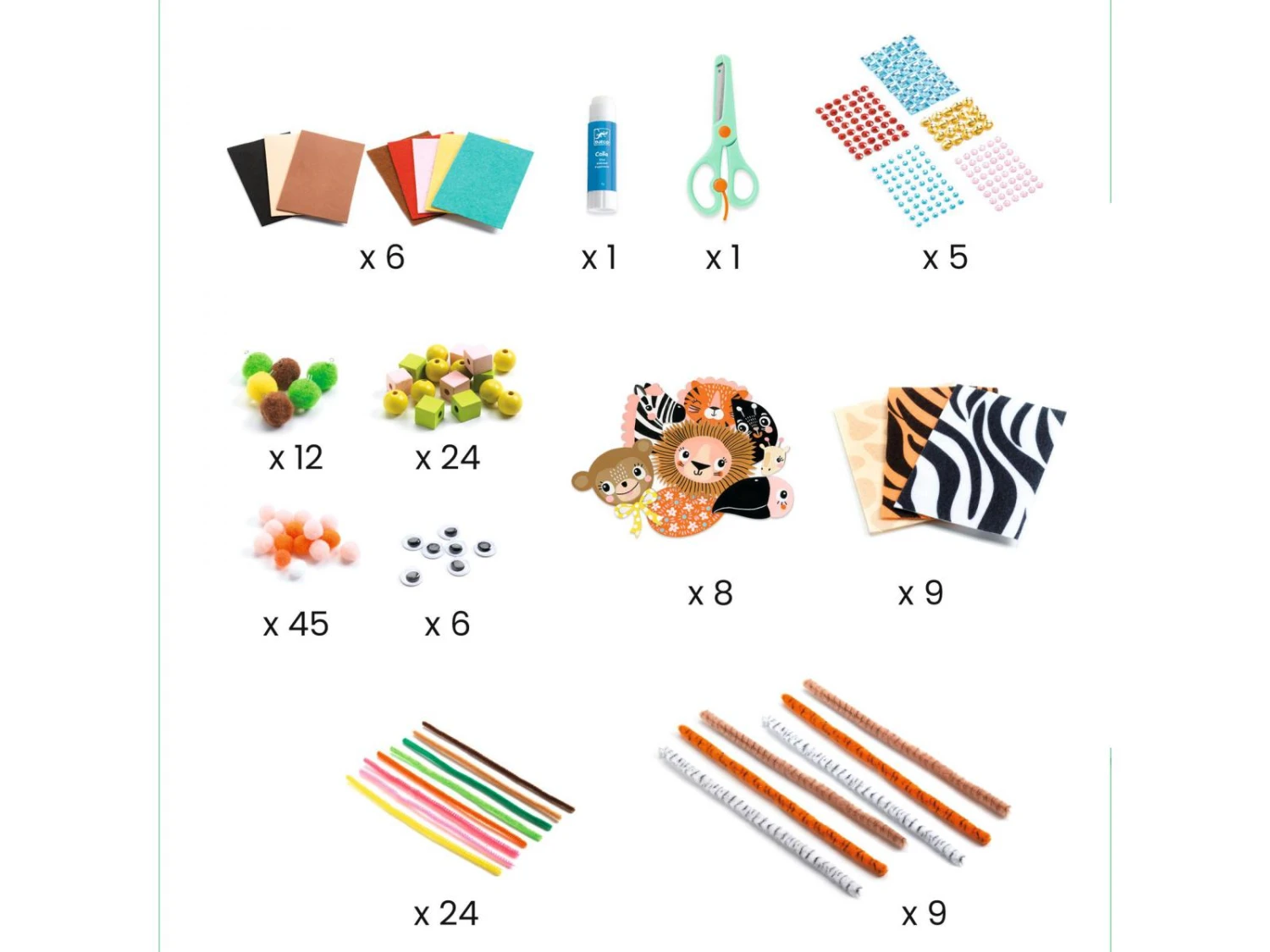 Profusion de matériel dans une grosse boîte (perles, pompons, yeux mobiles, pierres précieuses, fils chenilles…), pour des heures de créations. Tout est dans la boîte, même des idées.